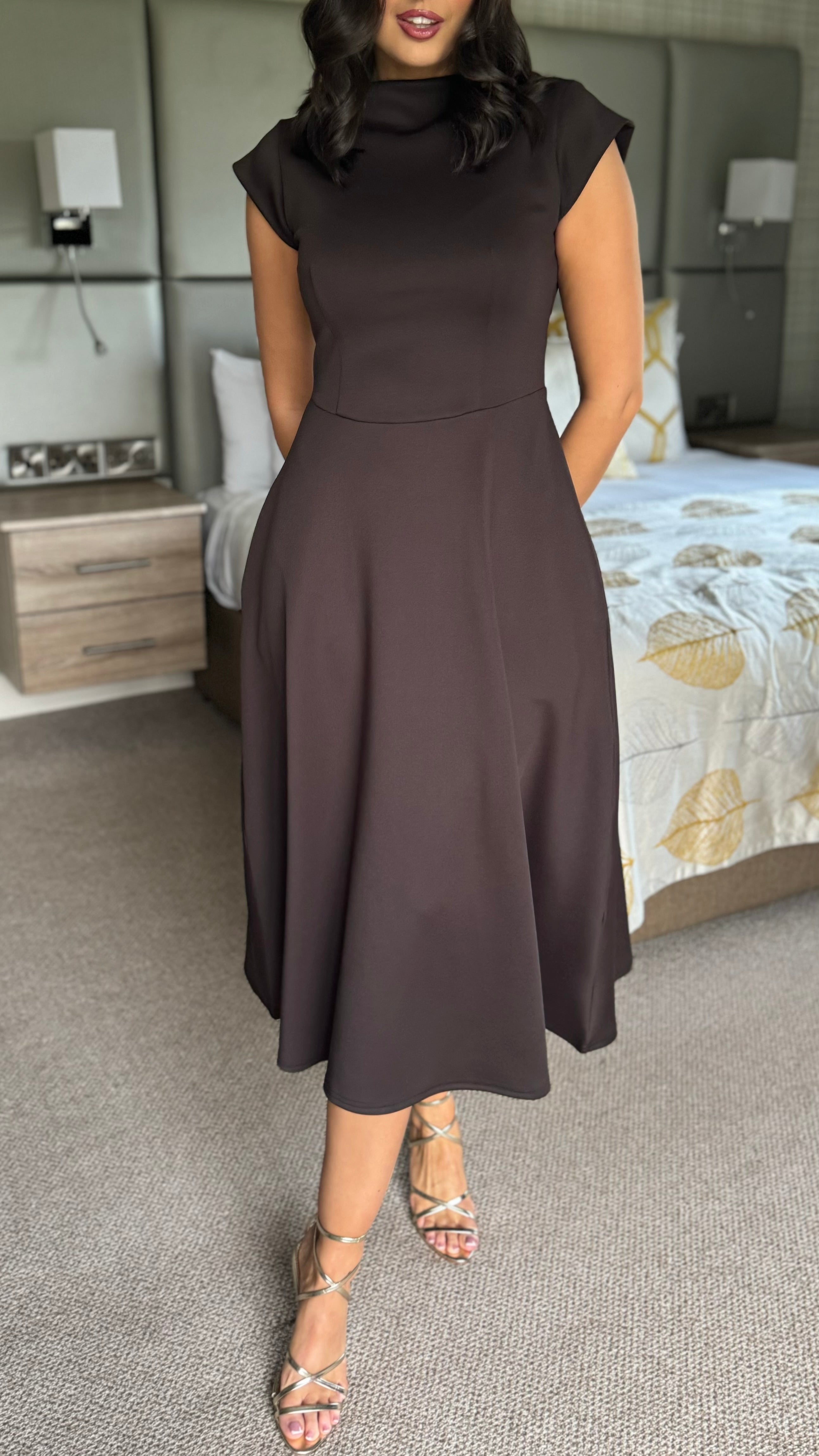 This Lexi Chocolate Brown Midi Dress brings playful charm with its boat neck and flirty cap sleeves. The skater skirt adds a fun twist, twirling effortlessly with every step, while handy pockets keep your essentials close. A concealed side zip ensures a sleek finish, making it your go-to for days when you want style and ease to dance together.