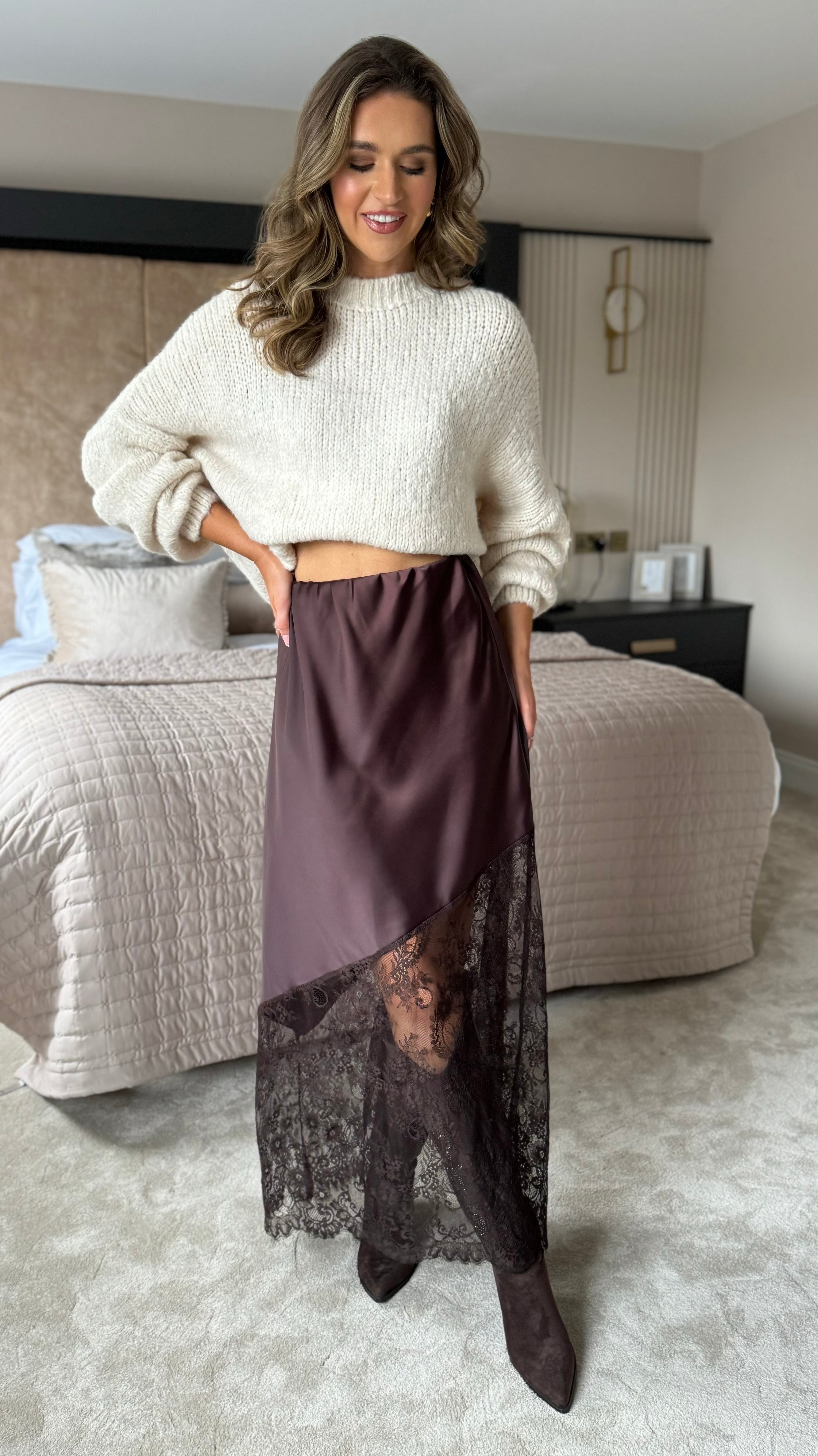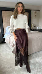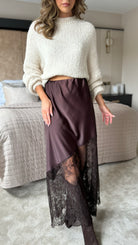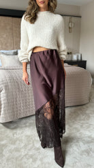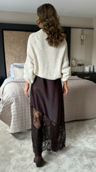 Ulyssa Dark Chocolate Brown Satin Maxi Skirt With Lace Trim