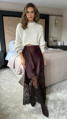 Elevate your wardrobe with the Ulyssa Chocolate Brown Satin Maxi Skirt, featuring a luxurious satin finish that feels silky smooth against the skin. Its elasticated waistband ensures a comfortable, flexible fit throughout the day, while the delicate lace trim adds a touch of elegant sophistication.