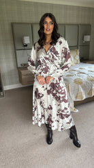 Winona Cream & Brown Satin Cow Print Long Sleeve Tie Detail Midi Dress