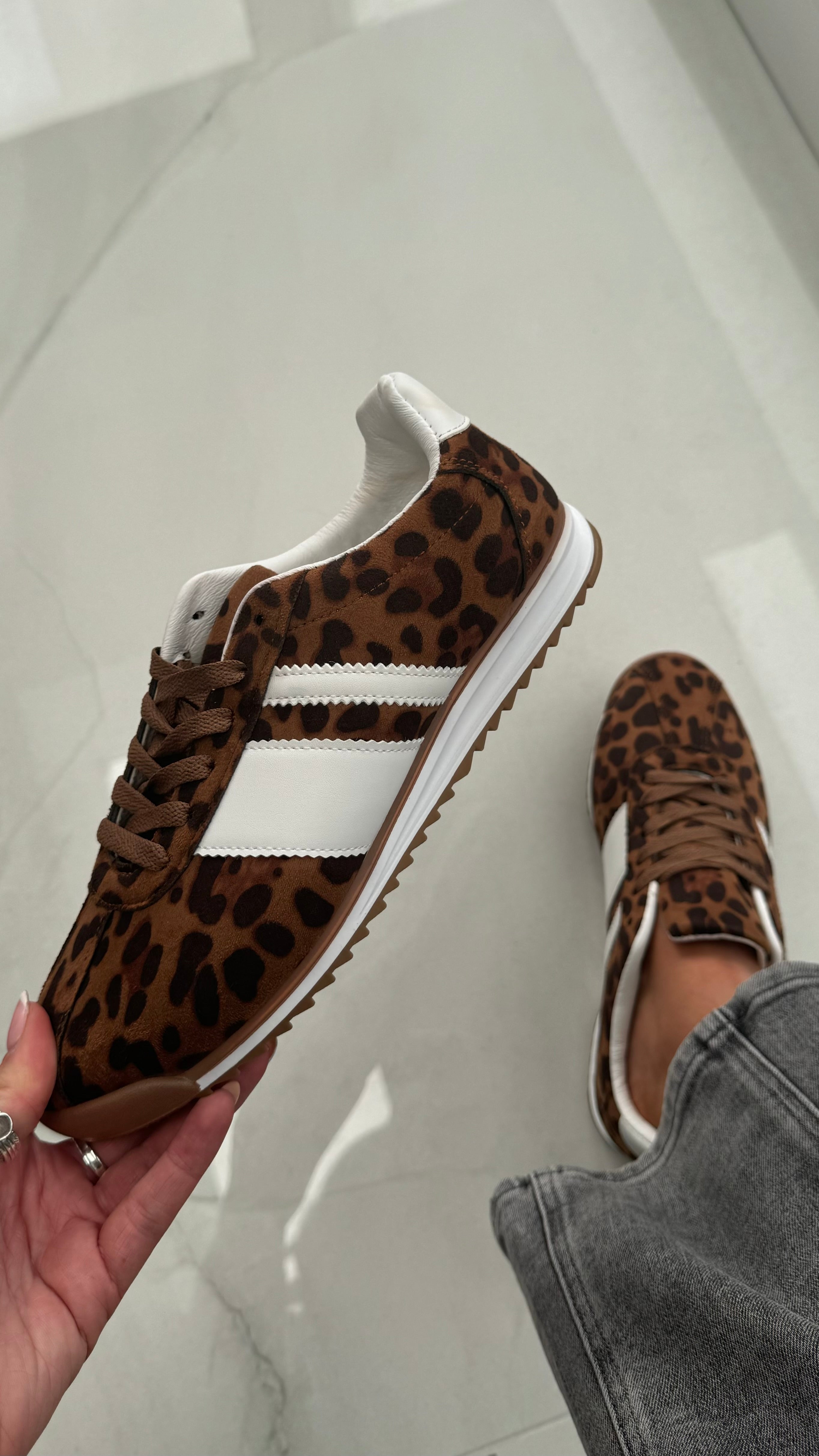 Step into fun and comfort with the Rue Leopard Print Stripe Detail Trainers. Featuring a grooved sole for extra grip and playful white stripes that pop against the bold leopard print, these trainers are tied together with stylish brown laces. Whether you’re out for a stroll or making a statement, enjoy every step in cosy, comfy style.