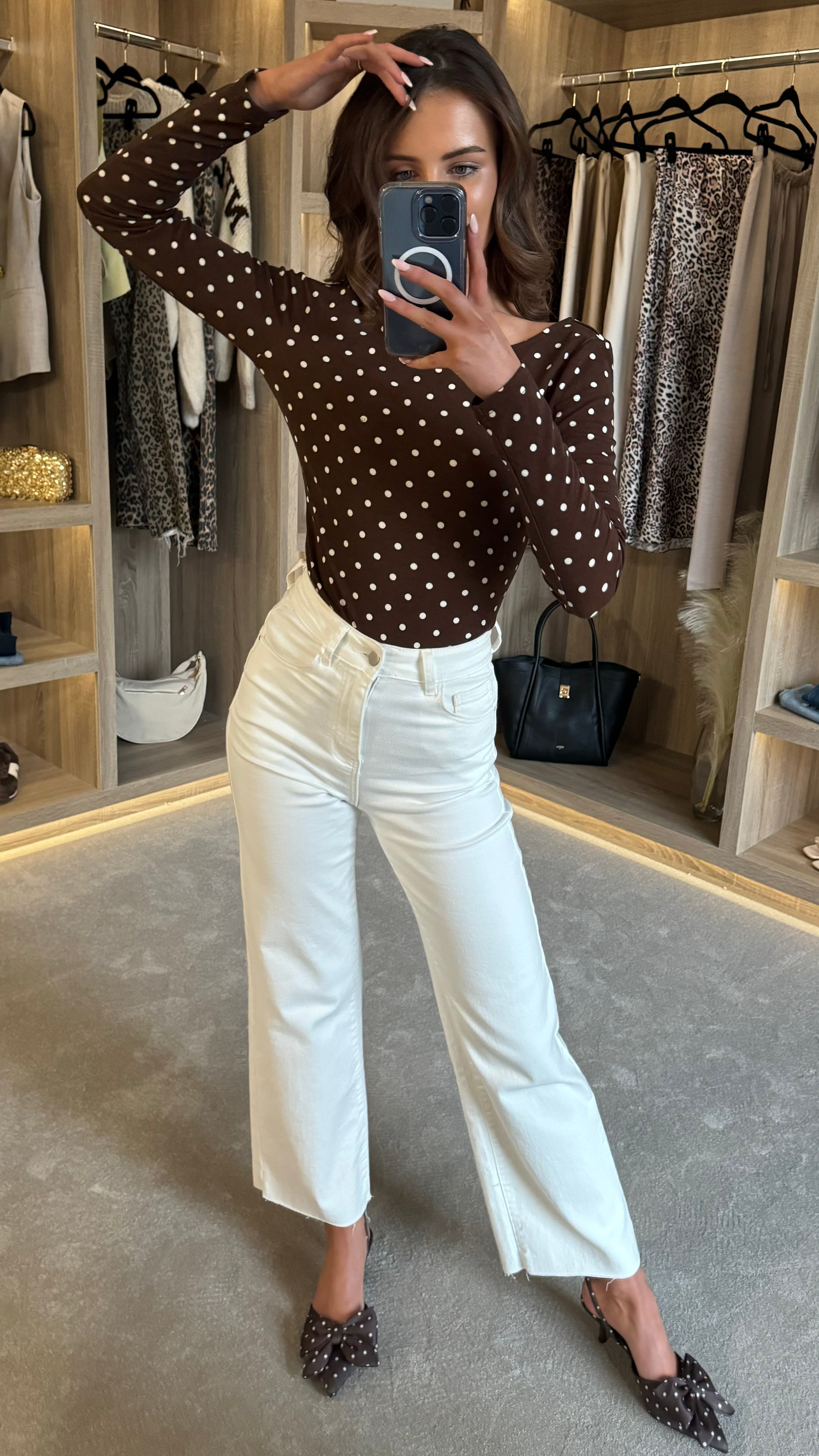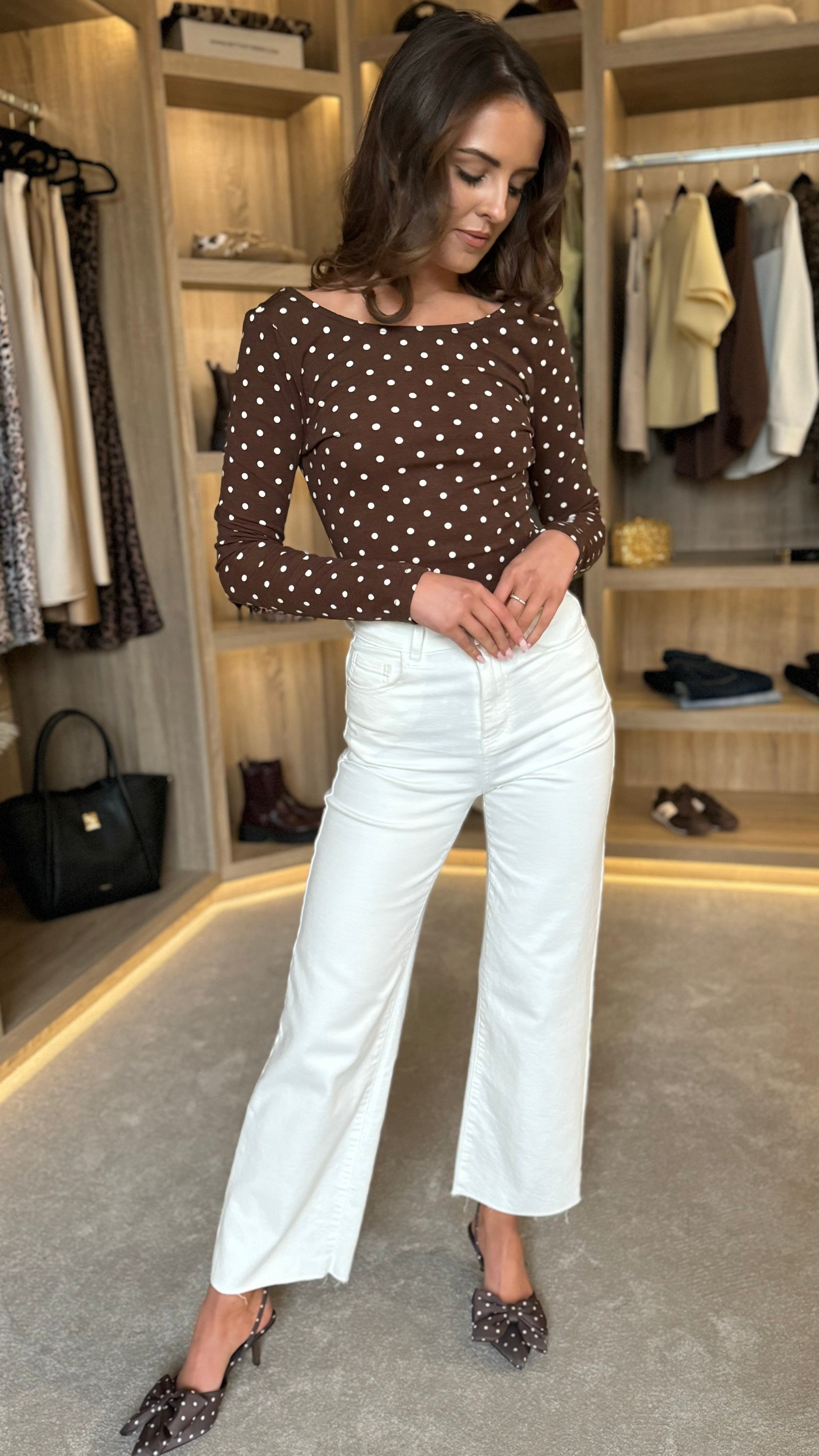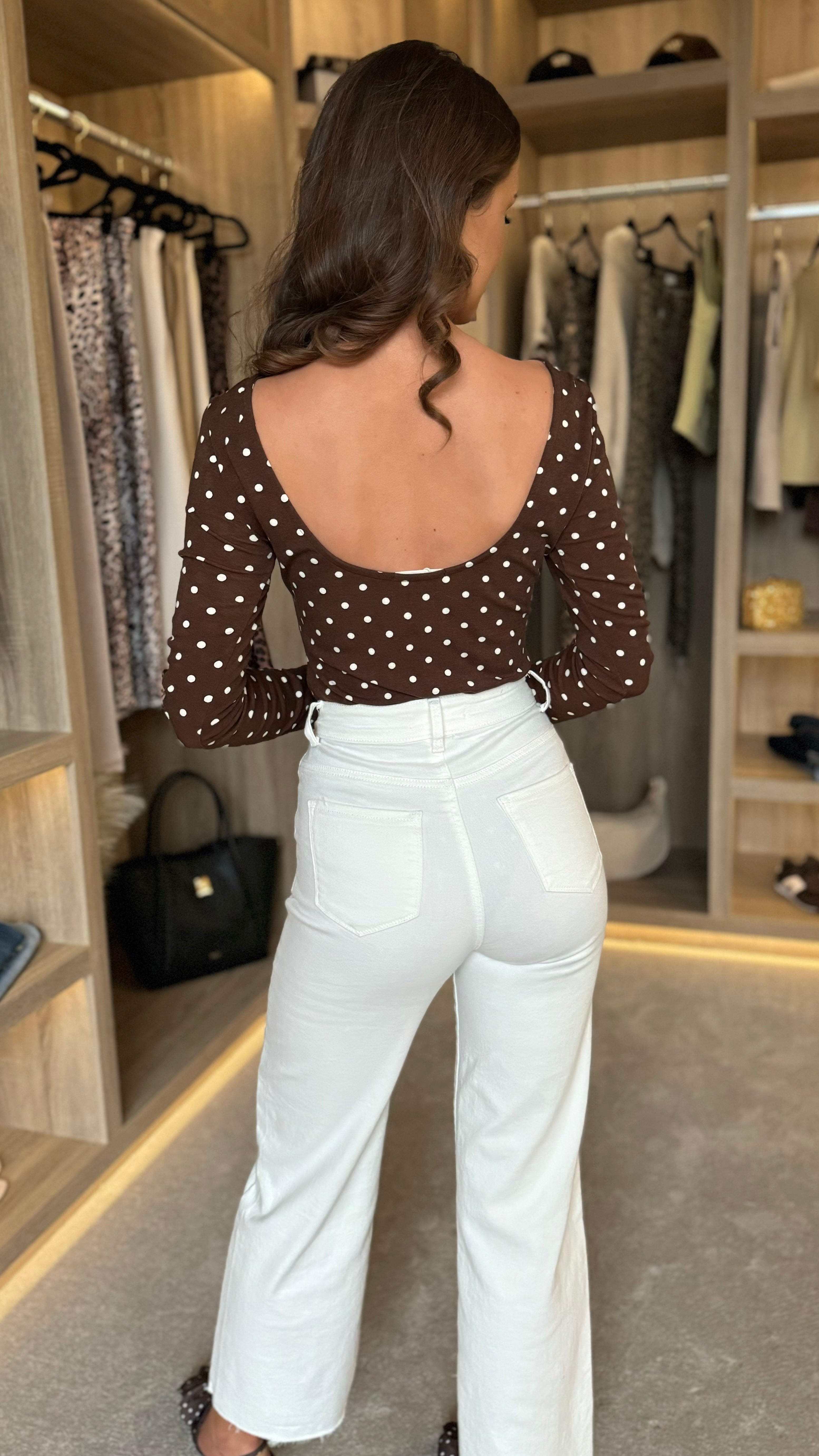 Slip into effortless style with this charming brown polka dot bodysuit. Featuring a flattering round neckline and long sleeves for versatile layering, the soft, stretchy fabric moves with you all day. The cheeky scoop back adds a flirty touch, while the secure clasp fastening keeps everything in place. Perfect for dressing up or down, this playful piece is your new go-to for looking put-together without the fuss.