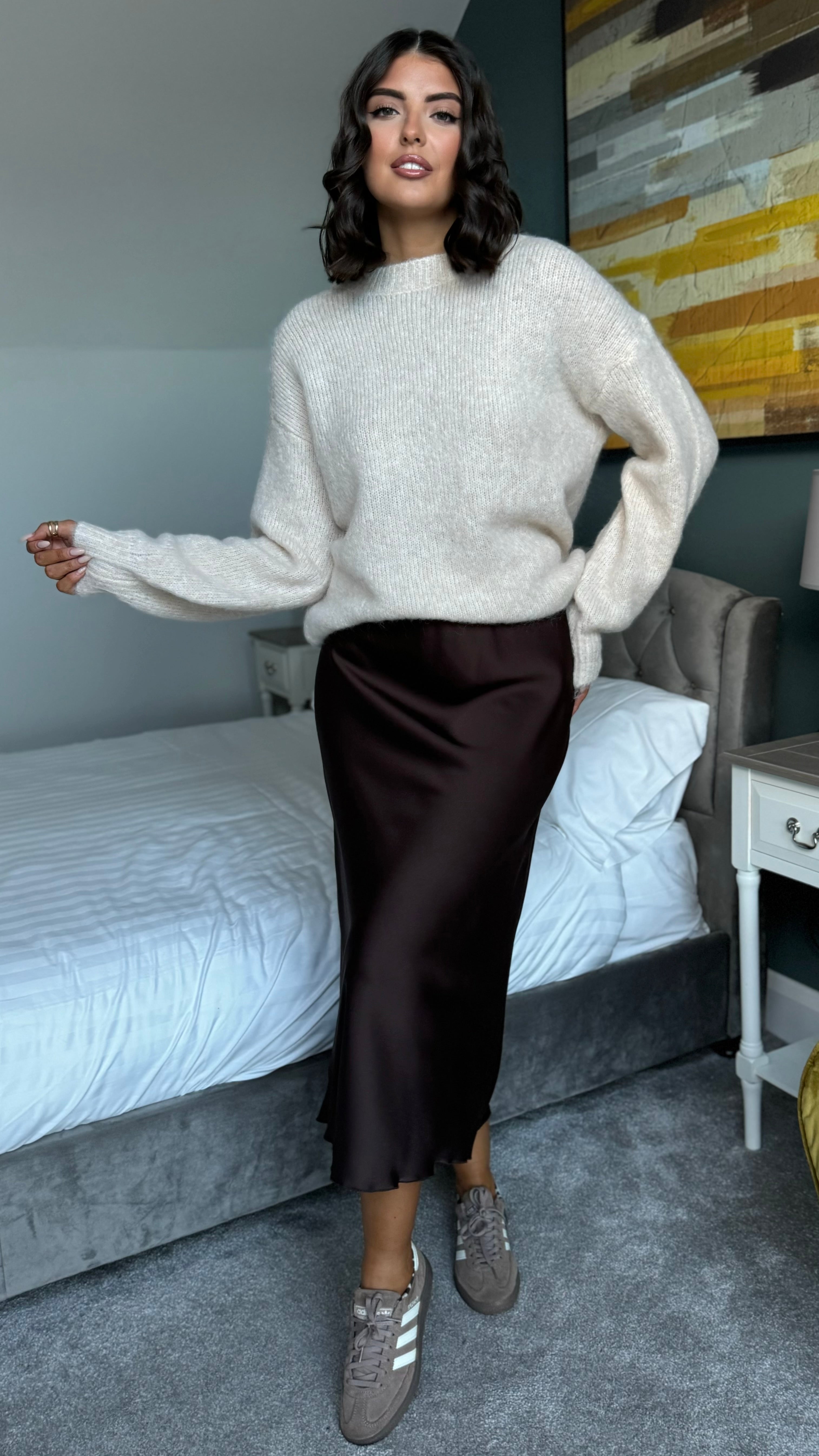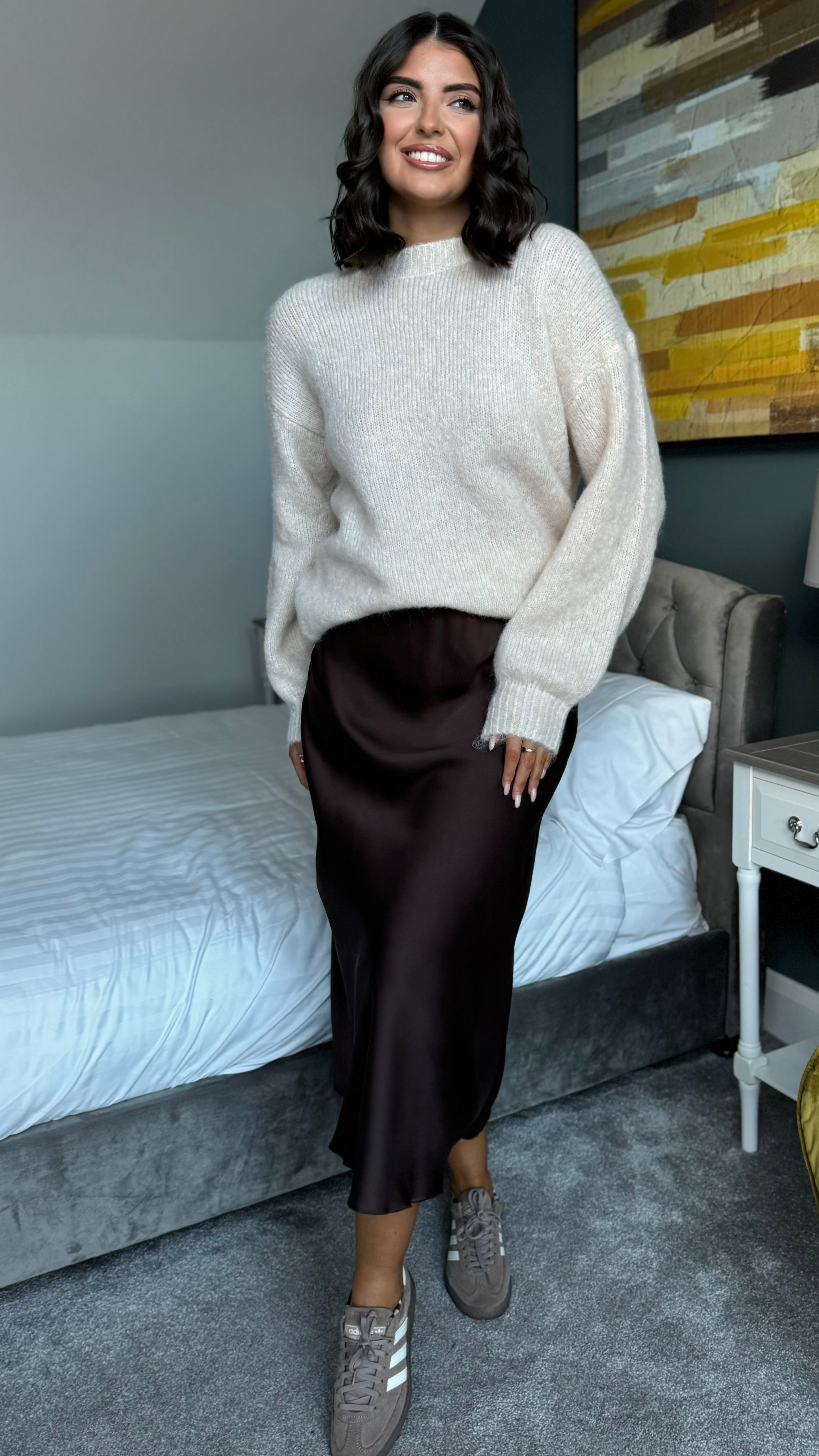 Make a statement with the Cullen Beige Polka Dot Bow Back Jumper—a playful twist on classic knitwear. This oversized beauty features a charming polka dot tie bow detail at the open back, perfect for showing off your style. The round neckline and long sleeves offer cosy comfort, while ribbed cuffs and hem keep everything in place. Effortlessly chic and undeniably fun, it's the jumper that works as hard as you do.