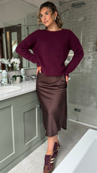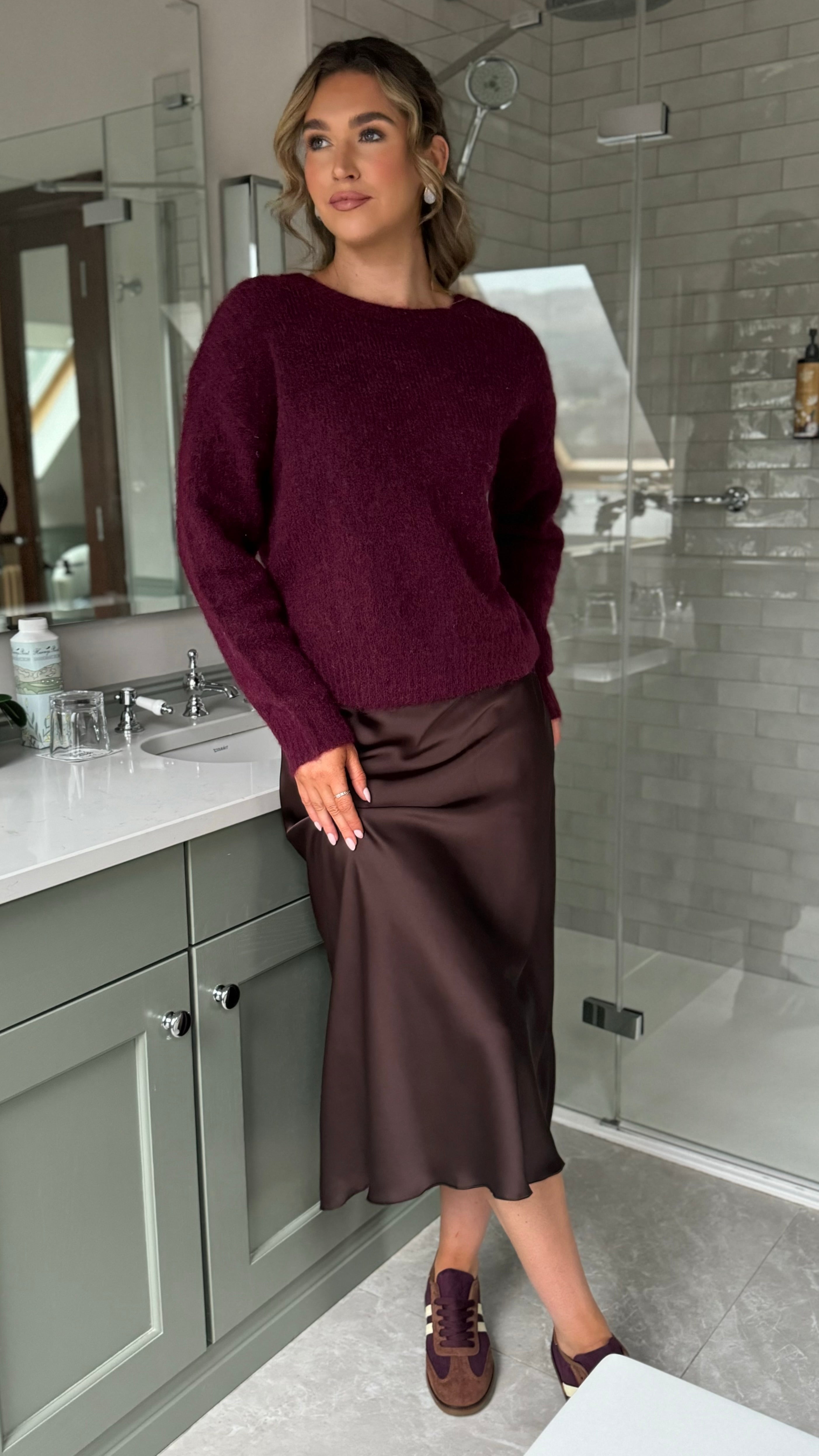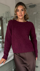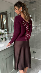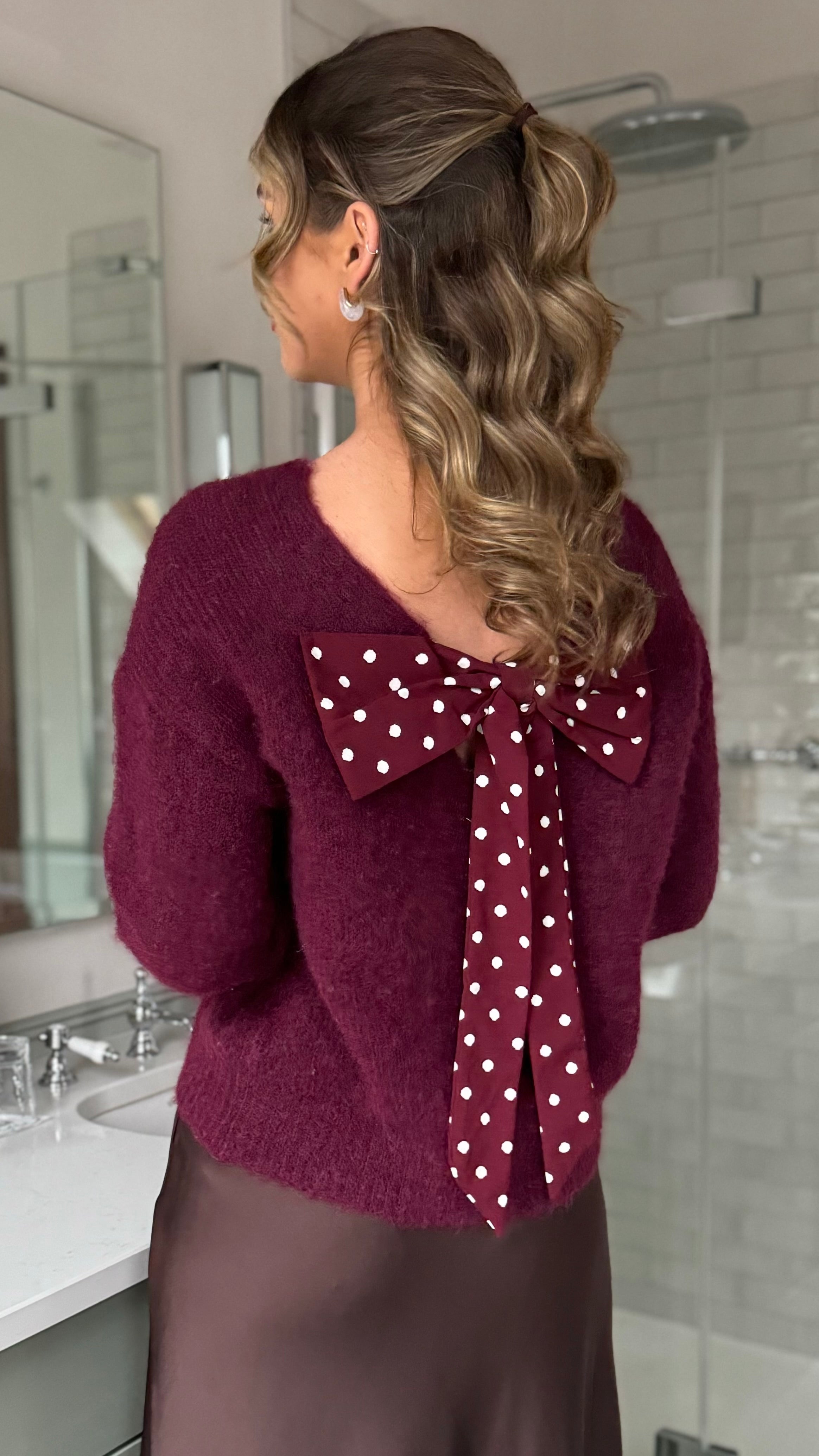 Elevate your knitwear game with this charming burgundy jumper that's equal parts cosy and chic. Featuring a playful polka dot bow detail at the back, a flattering V-neckline, and a round neck for versatile styling, this piece wraps you in softness. The fluffy fabric feels like a warm hug, making it perfect for layering or wearing solo. A fun twist on classic comfort that'll have you reaching for it again and again.