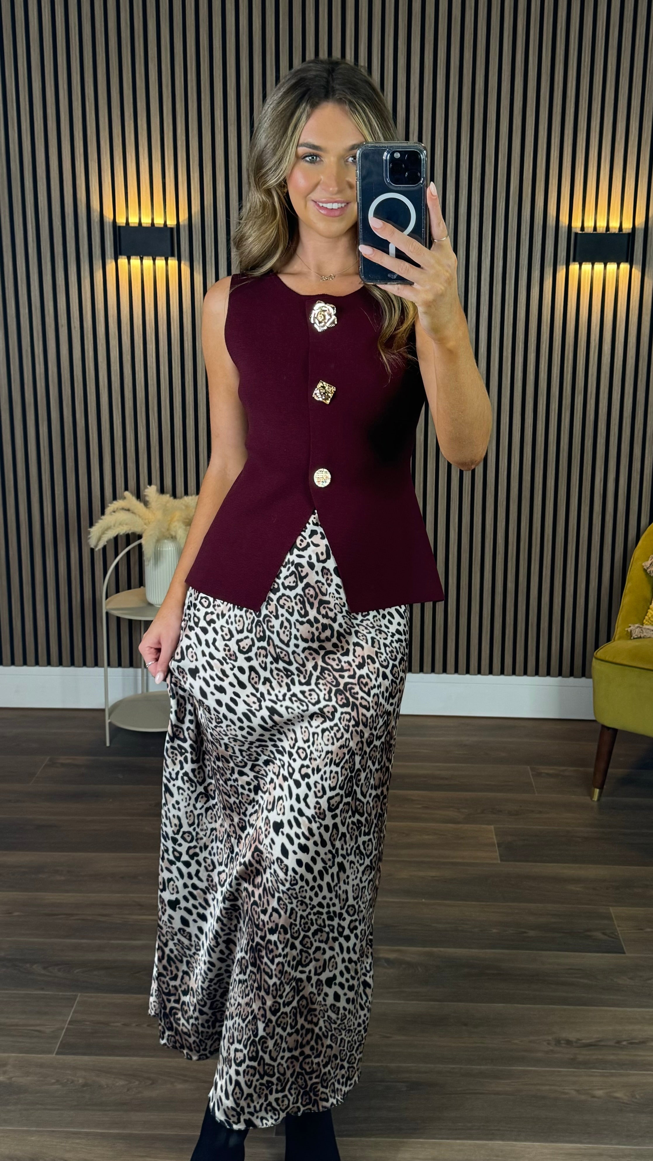 Liv Burgundy & Gold Detail Button Knitted Waistcoat
