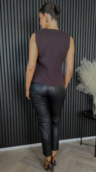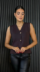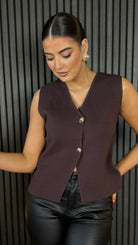 Elevate your wardrobe with this chic brown waistcoat that's giving sophisticated edge. The flattering V neckline draws the eye while luxe gold buttons add a touch of glamour to every layer. Crafted from soft knitted material, it's the perfect piece to throw over your favourite tops for instant polish. Whether you're dressing up or keeping it casual, this waistcoat is your new go-to for looking effortlessly put-together.