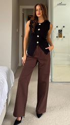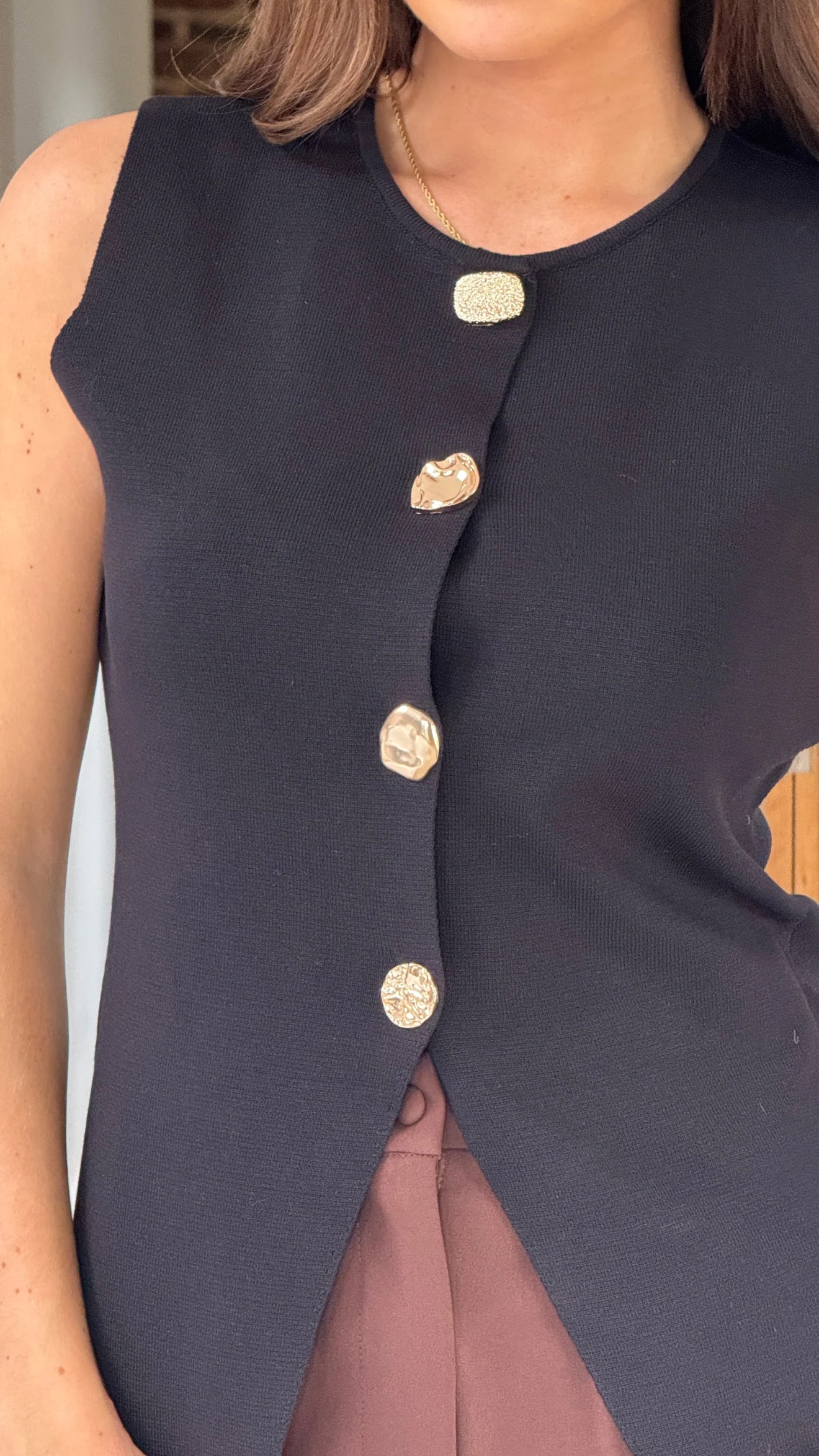 Add a dash of charm to your outfit with the Wednesday Black Knitted Waistcoat. Featuring eye-catching gold buttons and a cozy knitted texture, this waistcoat brings warmth and style together effortlessly. The playful split front adds a flirty twist, making it perfect for layering over your favourite tops or dresses with a fun, fashionable edge.