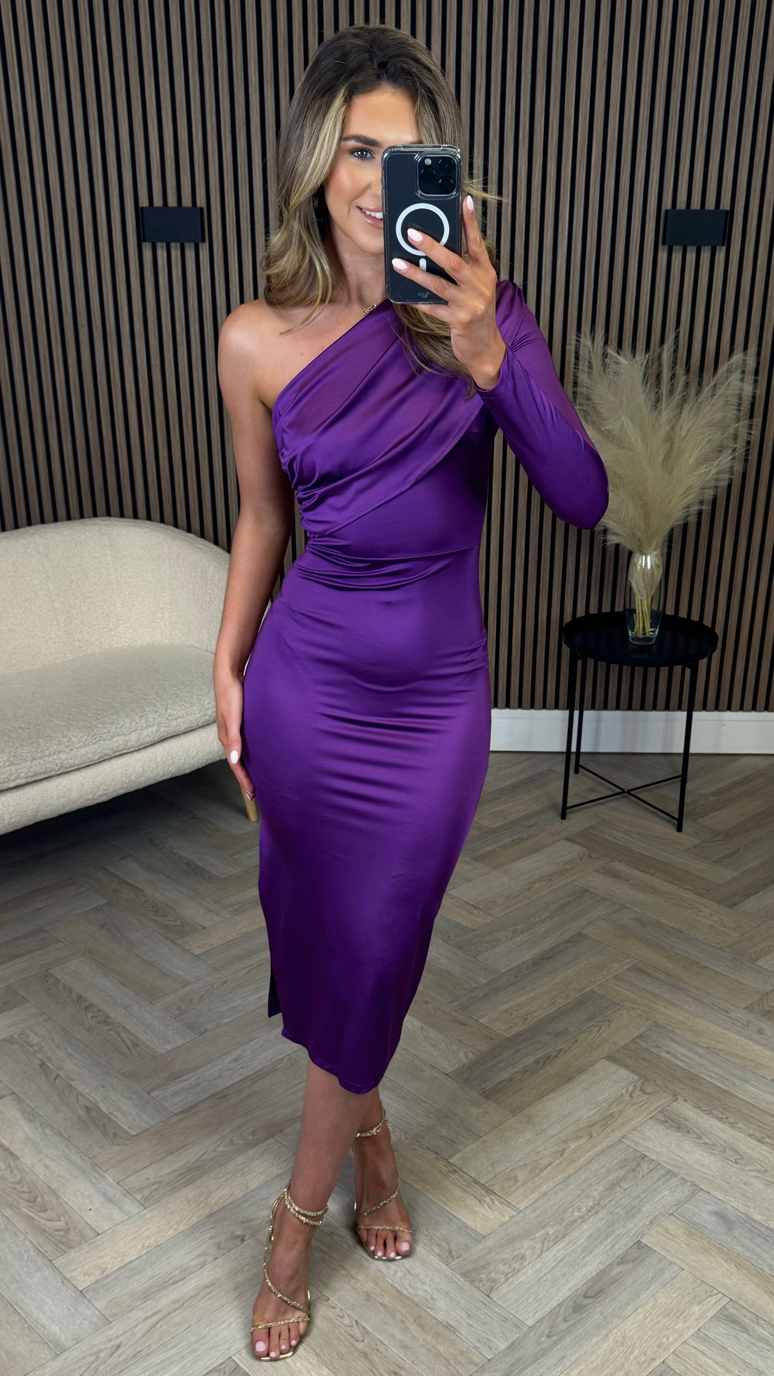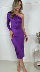 Adele Purple One Shoulder Draped Detail Midi Dress