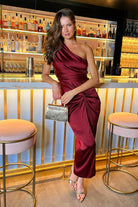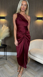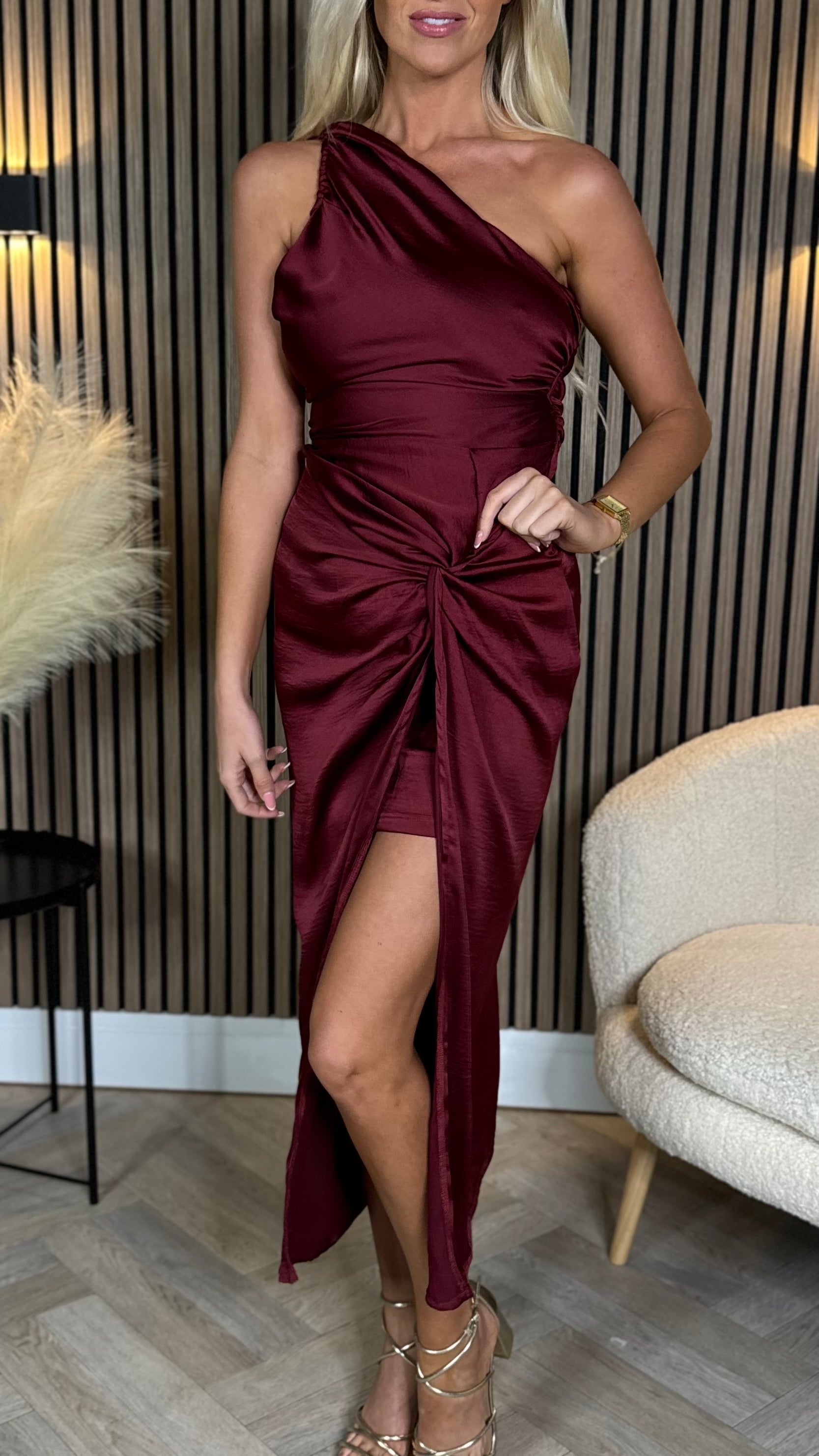 Get ready for your special occasion with our Alexis Burgundy One Shoulder Knot Skirt Satin Midi Dress! Featuring a statement one shoulder design and a ruched top for a unique touch. The knot front creates a draped midi length skirt with a split and lining, perfect for showing off your strappy heels. Add a matching bag and your favorite accessories for a glam evening look! 💃