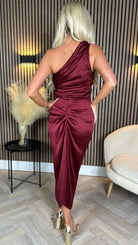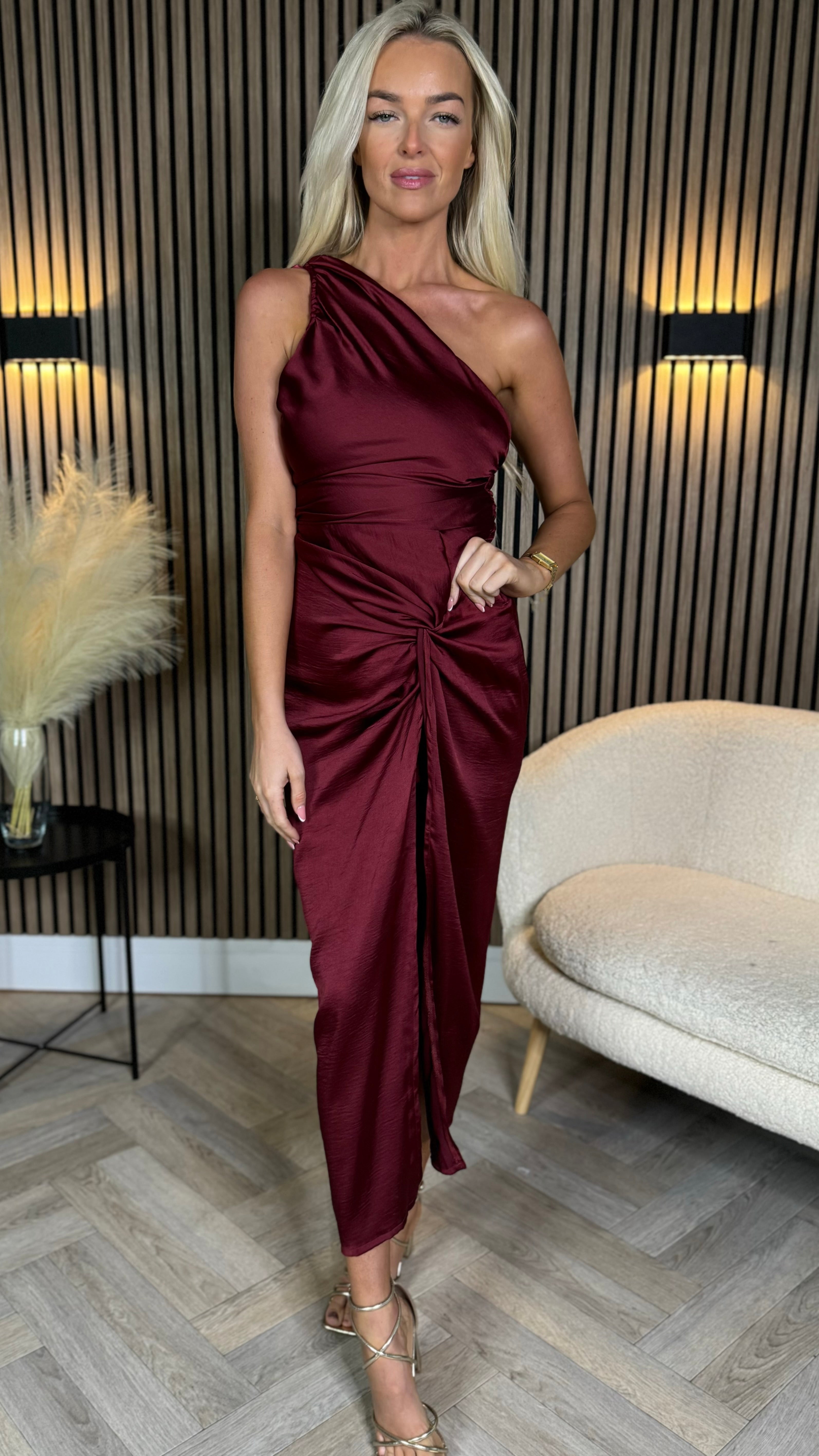 Alexis Burgundy One Shoulder Knot Skirt Satin Midi Dress