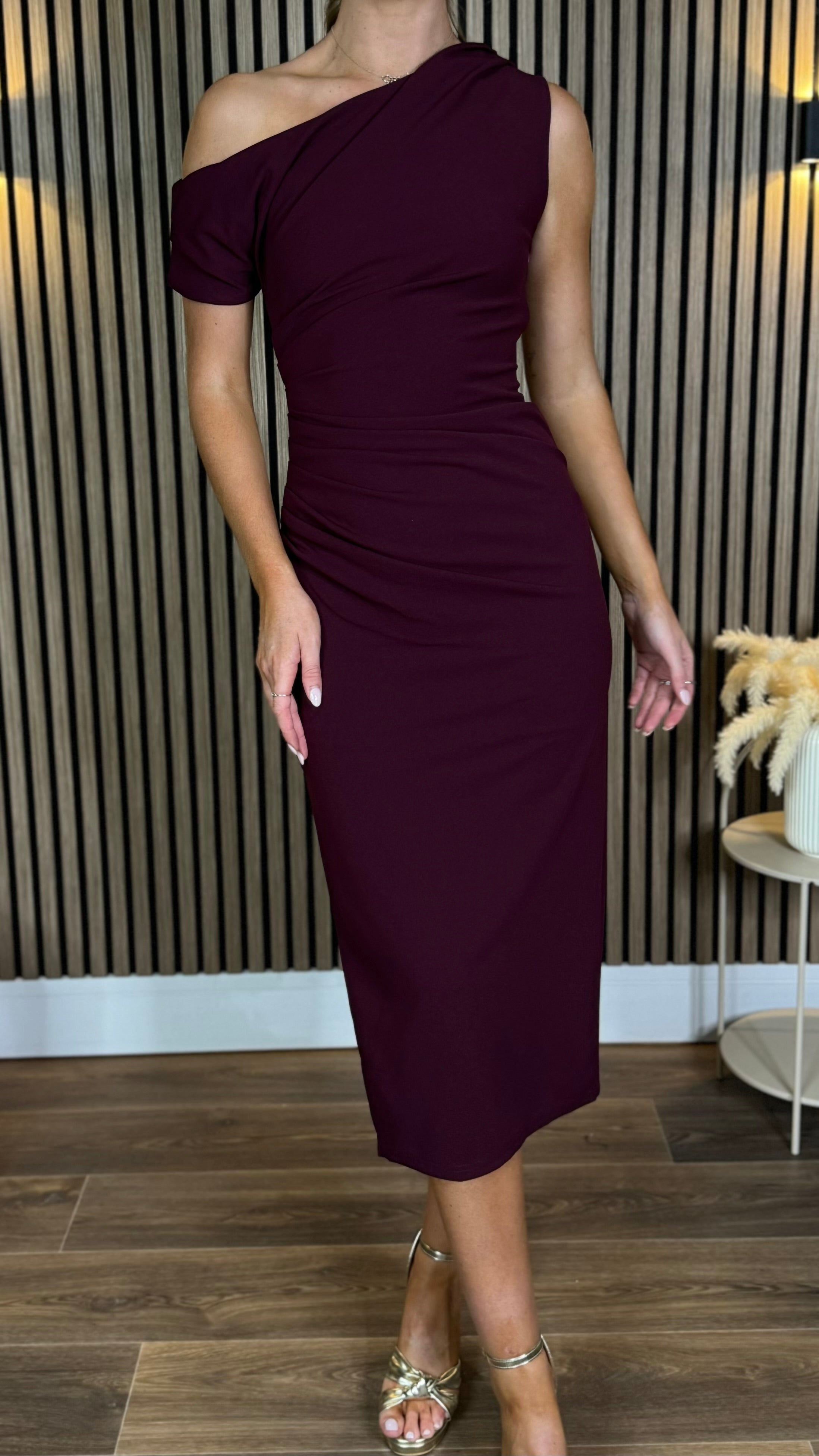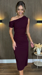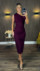 The Allie Plum Asymmetrical Ruched Midi Dress shines in a stunning plum hue 🍇, blending delicate ruching with a trendy asymmetrical neckline for a look that’s both elegant and playful. Its sleek silhouette and midi length create a polished vibe that’s perfect for upscale events 💃✨. Elevate your formal wardrobe with this chic, eye-catching dress!