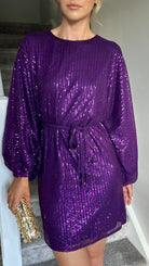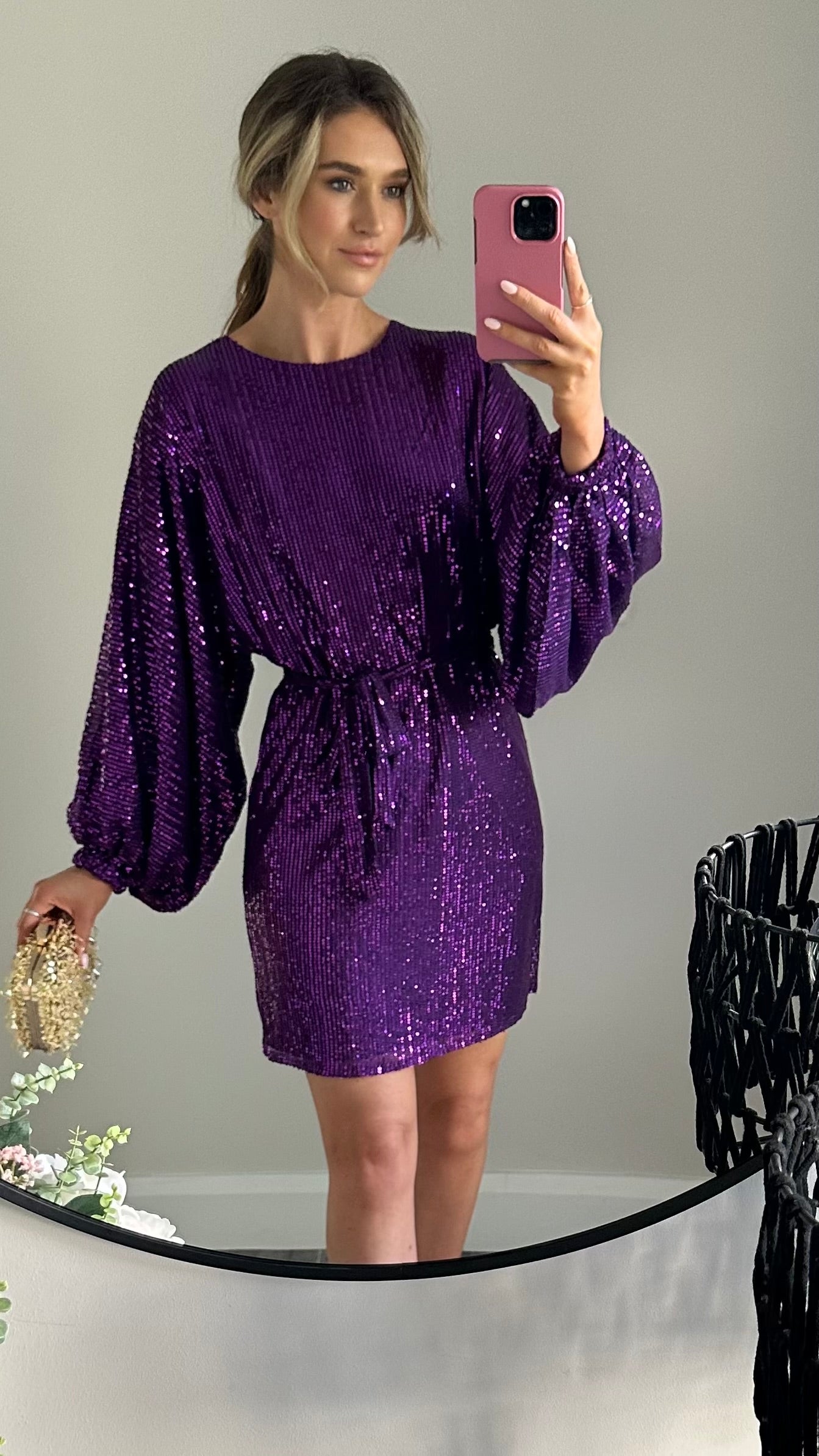 Get ready to shine in the Alyona Purple Sequin Wide Sleeve Mini Dress 😍 This mini dress features a round neckline, belted waist, and wide sleeves for a fun and flirty look. Show off your playful side with its eye-catching sequin design ✨ Perfect for a night out or special occasion, this dress will have you turning heads and feeling fabulous.
