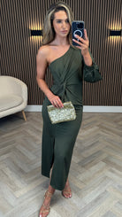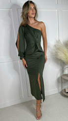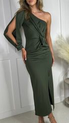 One shoulder, one sleeve, and plenty of style. The Arianna Khaki Midi Dress features a unique ruched detail and a chic midi length. It's perfect for adding a touch of playful sophistication to your wardrobe. 💃🏼