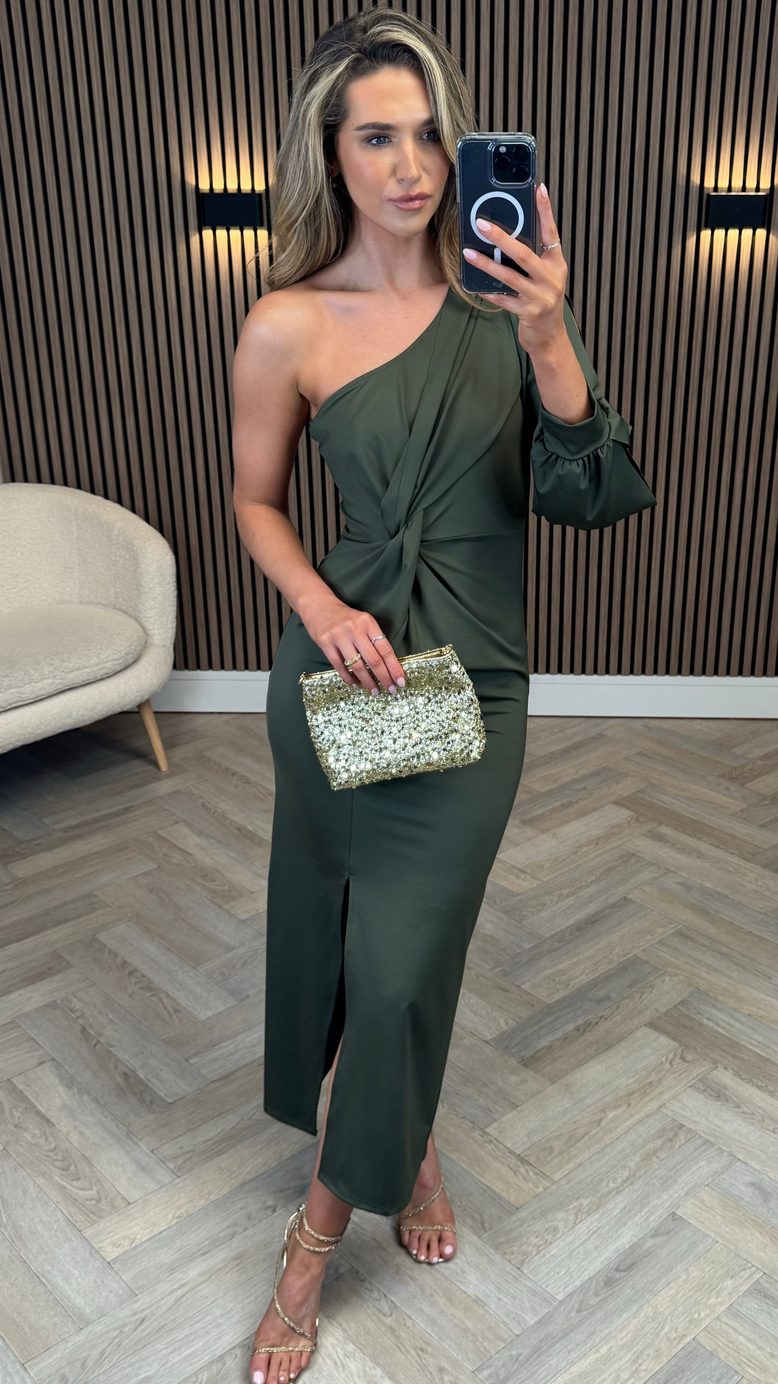 Arianna Khaki One Sleeve Ruched Detail Midi Dress