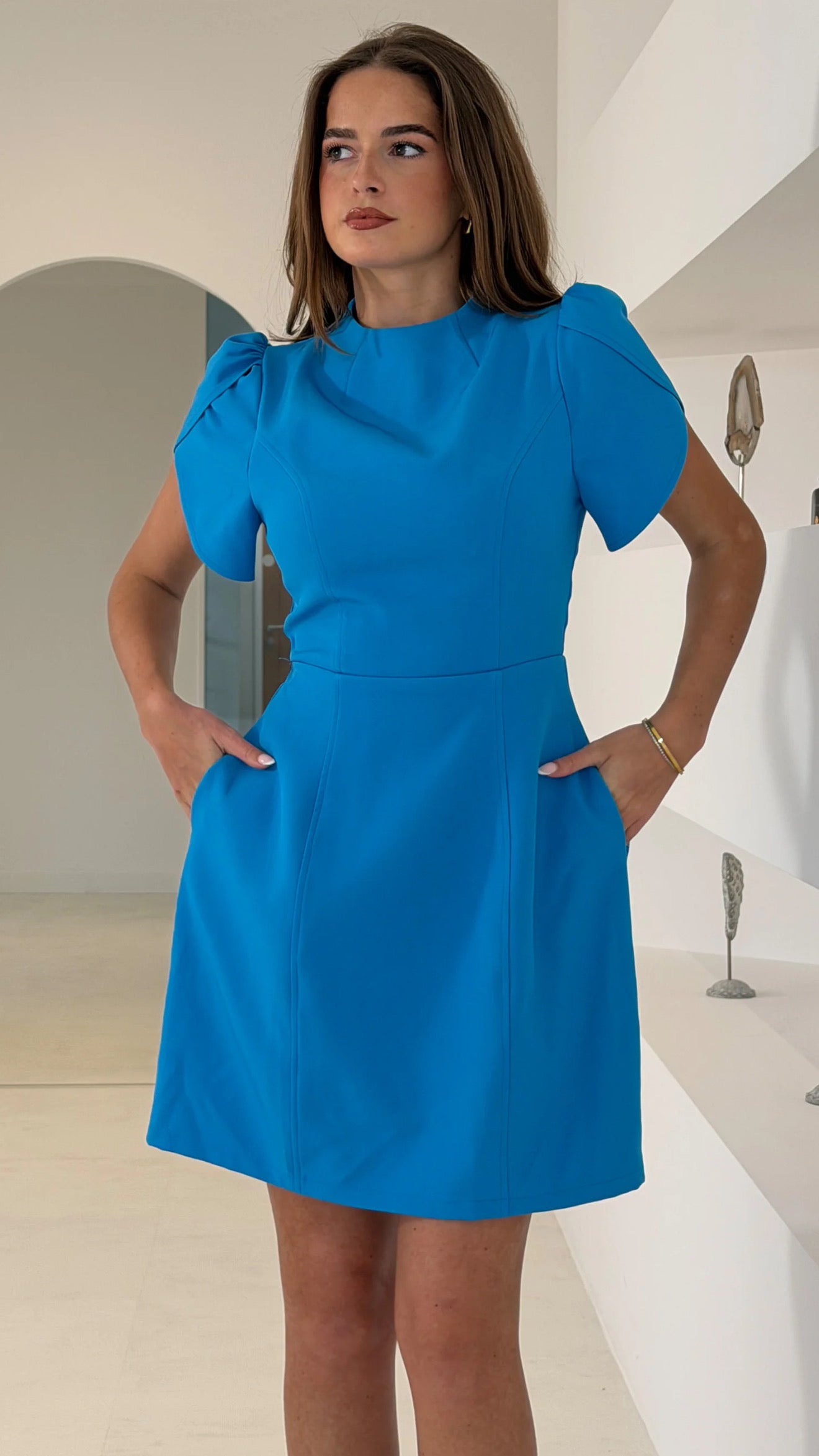 Elevate your everyday style with this charming blue tulip skirt dress featuring a chic high neckline and playful puff sleeves that add instant personality. The flattering tulip silhouette skims your curves beautifully, while the mini length keeps things fun and flirty. Practical hidden pockets let you stash your essentials without disrupting the sleek lines, and a discreet back zip ensures a smooth, polished finish. Perfect for brunch dates, casual outings, or whenever you want to turn heads with effortless charm.