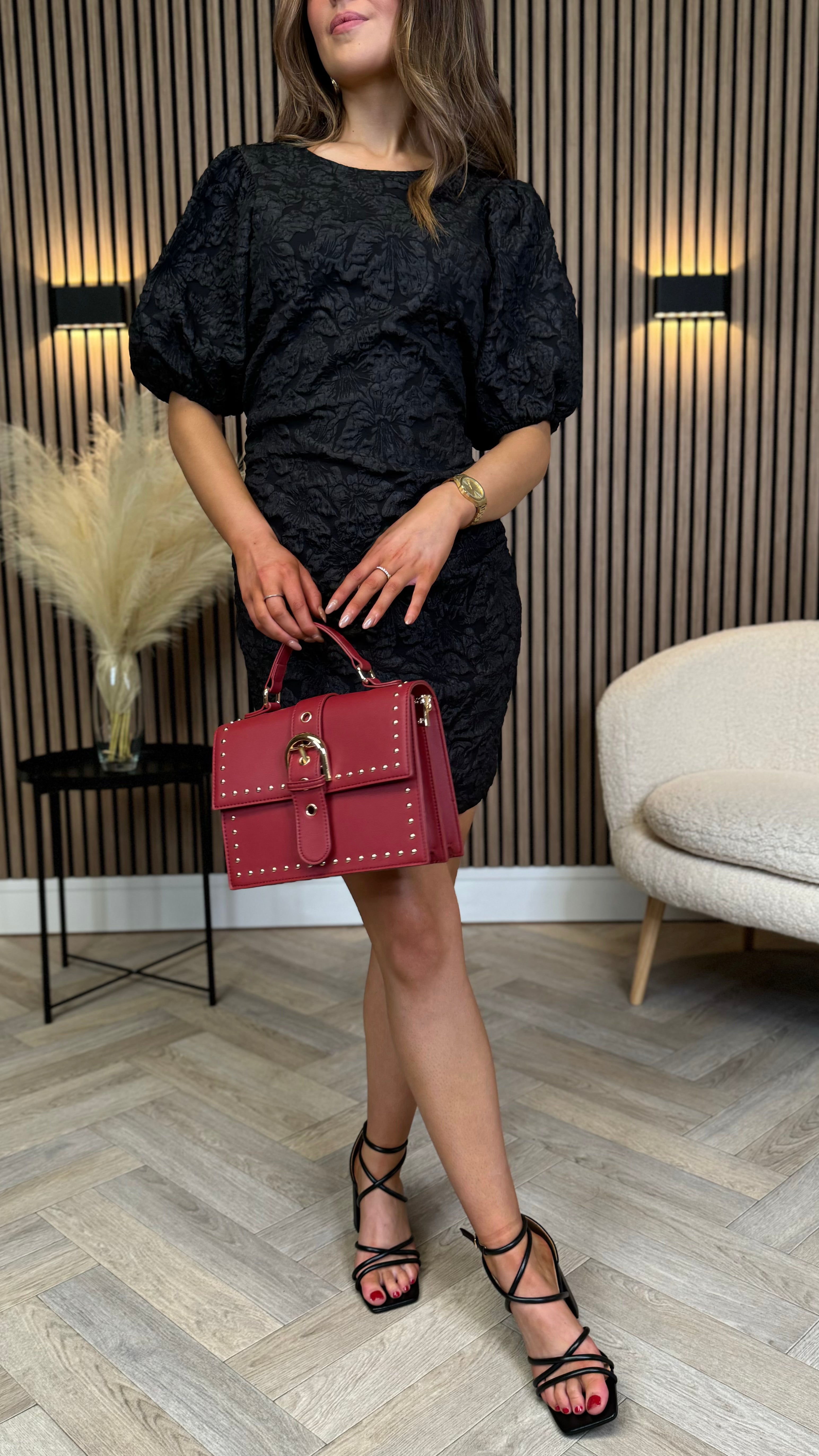 Get ready to turn heads in the Breanna Dress, featuring a playful mini silhouette, short puff sleeves, and a stunning black floral jacquard fabric. You'll feel like a queen in this unique and stylish dress. 👑🌸 #queenofstyle