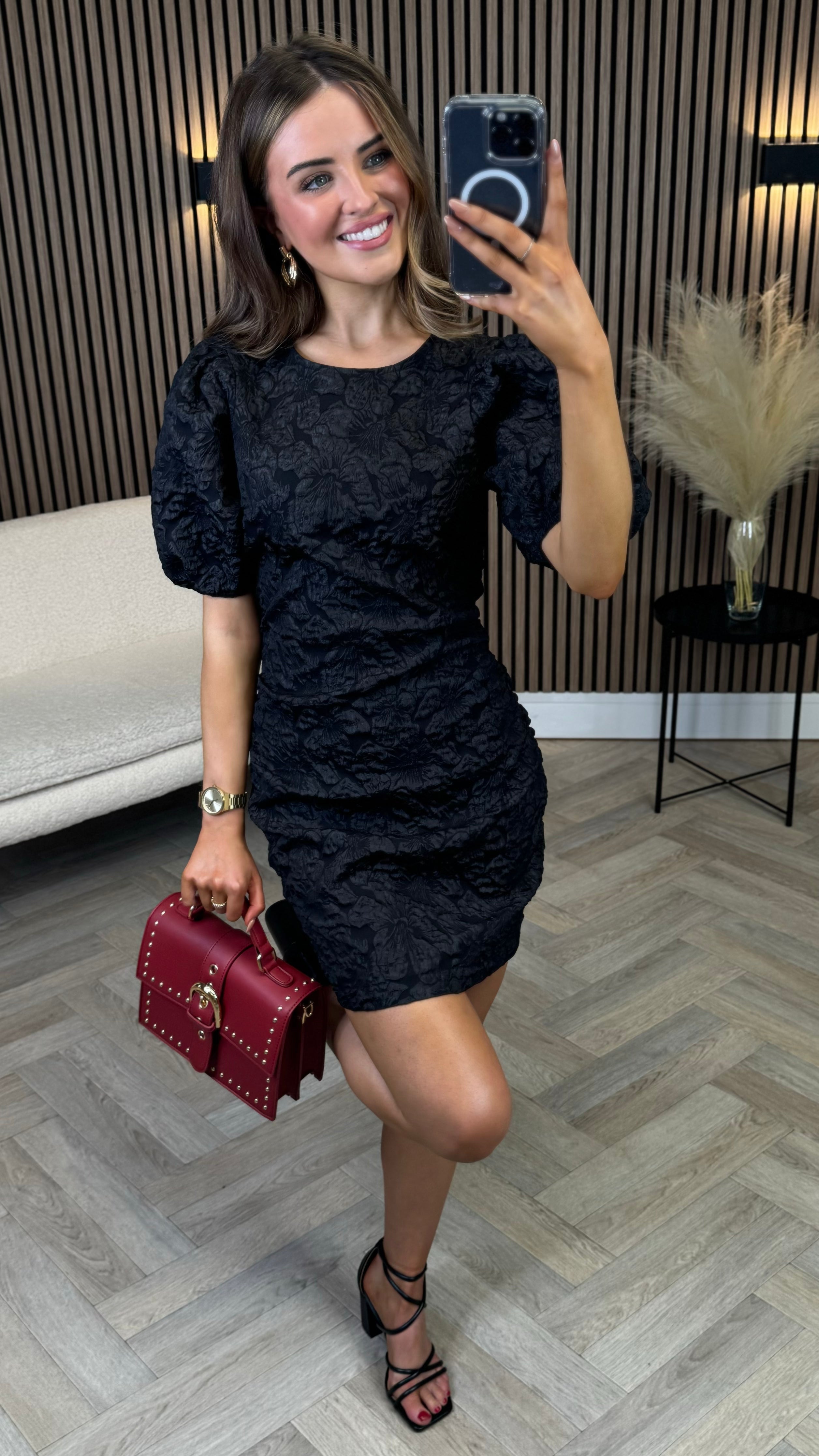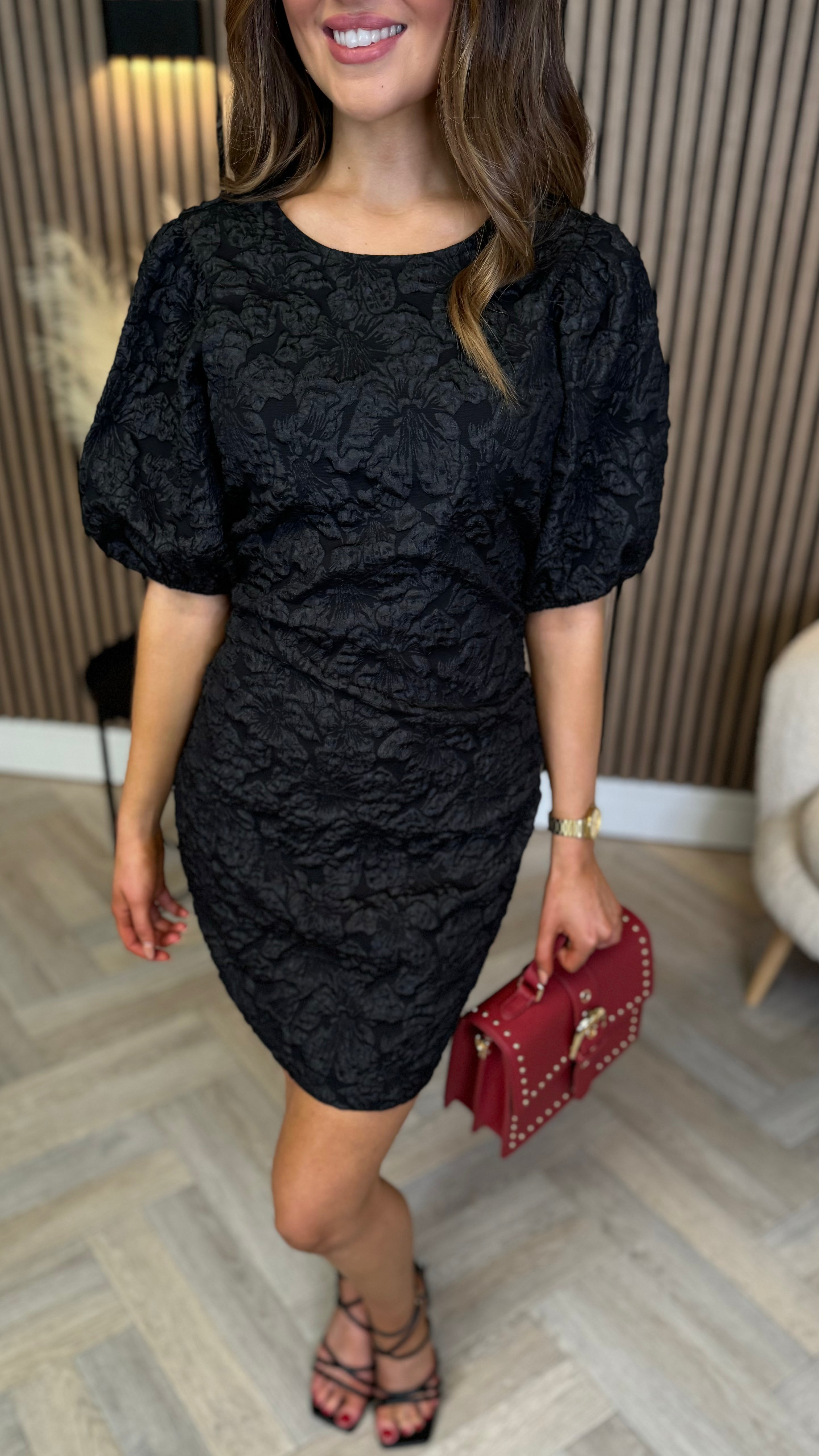 Breanna Black Floral Jacquard Puff Sleeves Dress