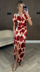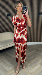 Get ready to make a statement with our Rust Printed Puff Sleeve Front Split Midi Dress. With a v-neckline, short puff sleeves, and an elasticated waist with ruched detailing, this dress will flatter your figure and keep you comfortable all day. Perfect for any occasion, just add heels and a matching bag for a complete look! 💃🏽🔥