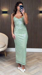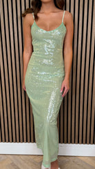Be the life of the party with the Clemmie Light Green Sequin Detail Midi Dress! This stunning dress features a backless design with a single strap across the back and a seductive back split. The cami straps add a touch of elegance. Get ready to sparkle and turn heads all night long! ✨😍