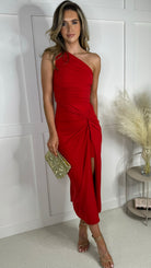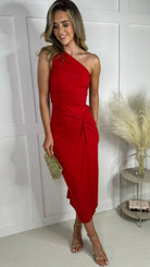 Clover Red One Shoulder Knot Skirt Midi Dress