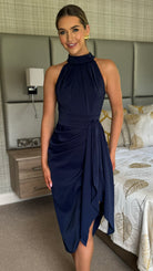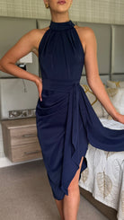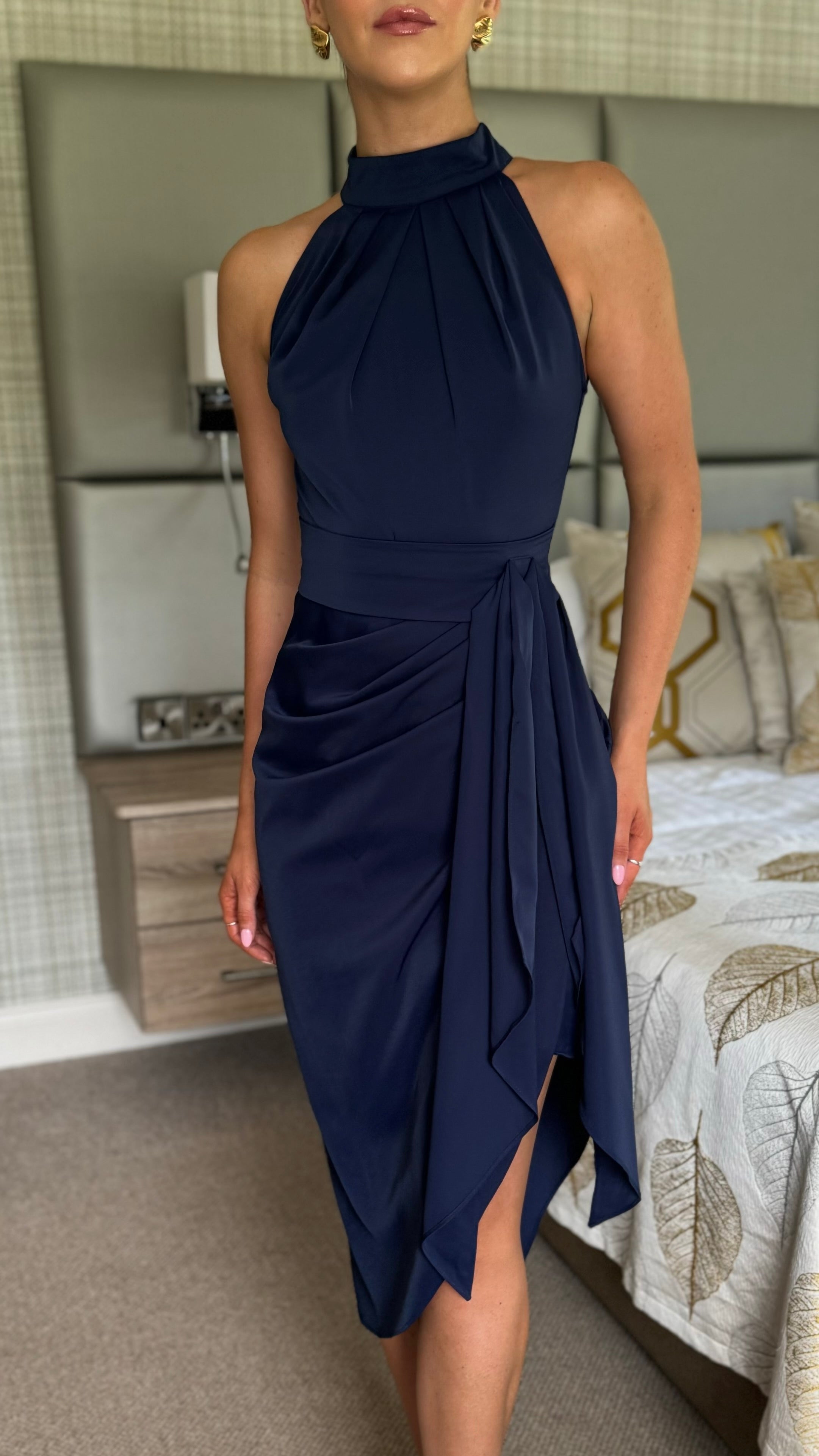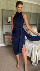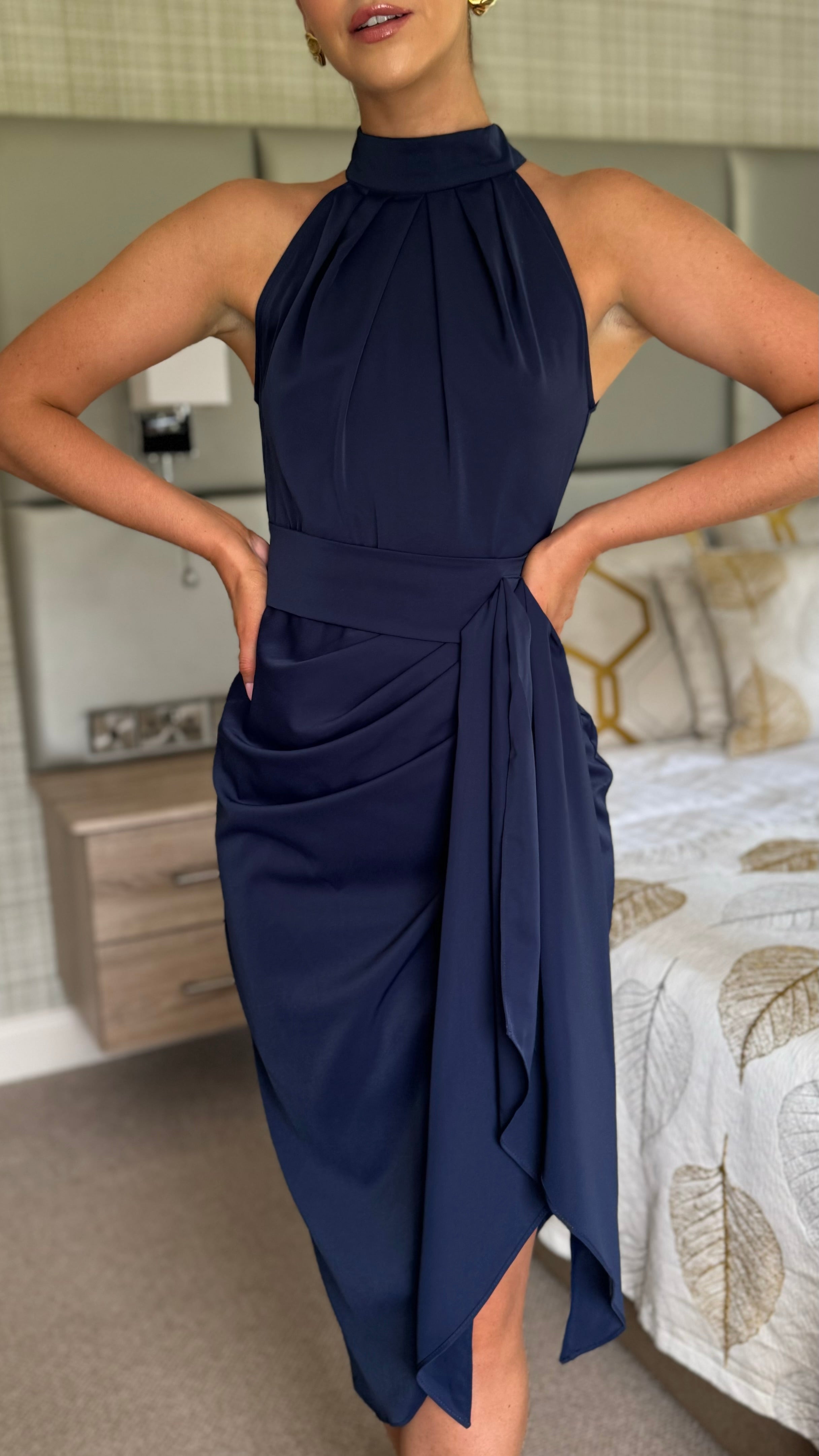 Demi Navy Halter Neck Tie Waist Midi Dress