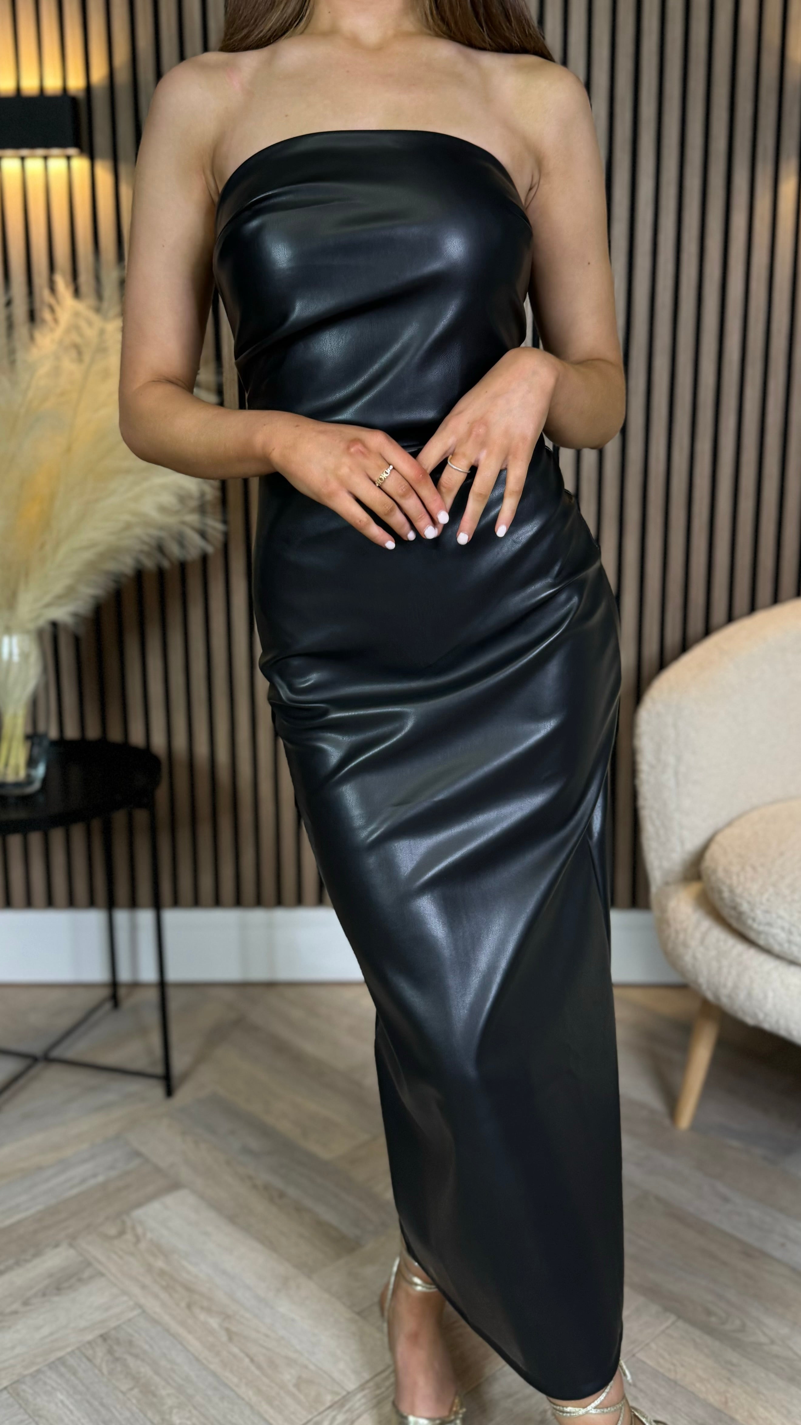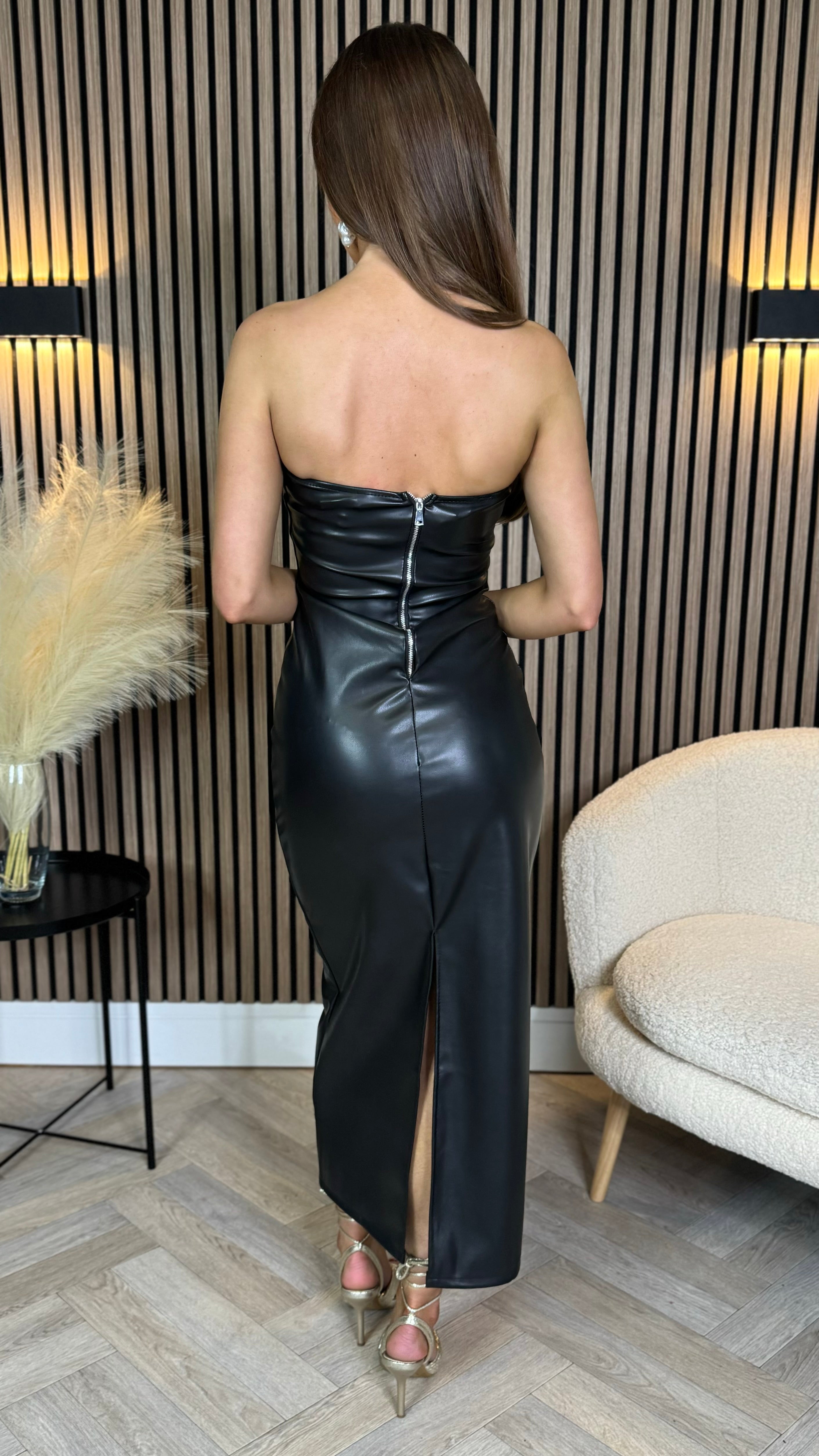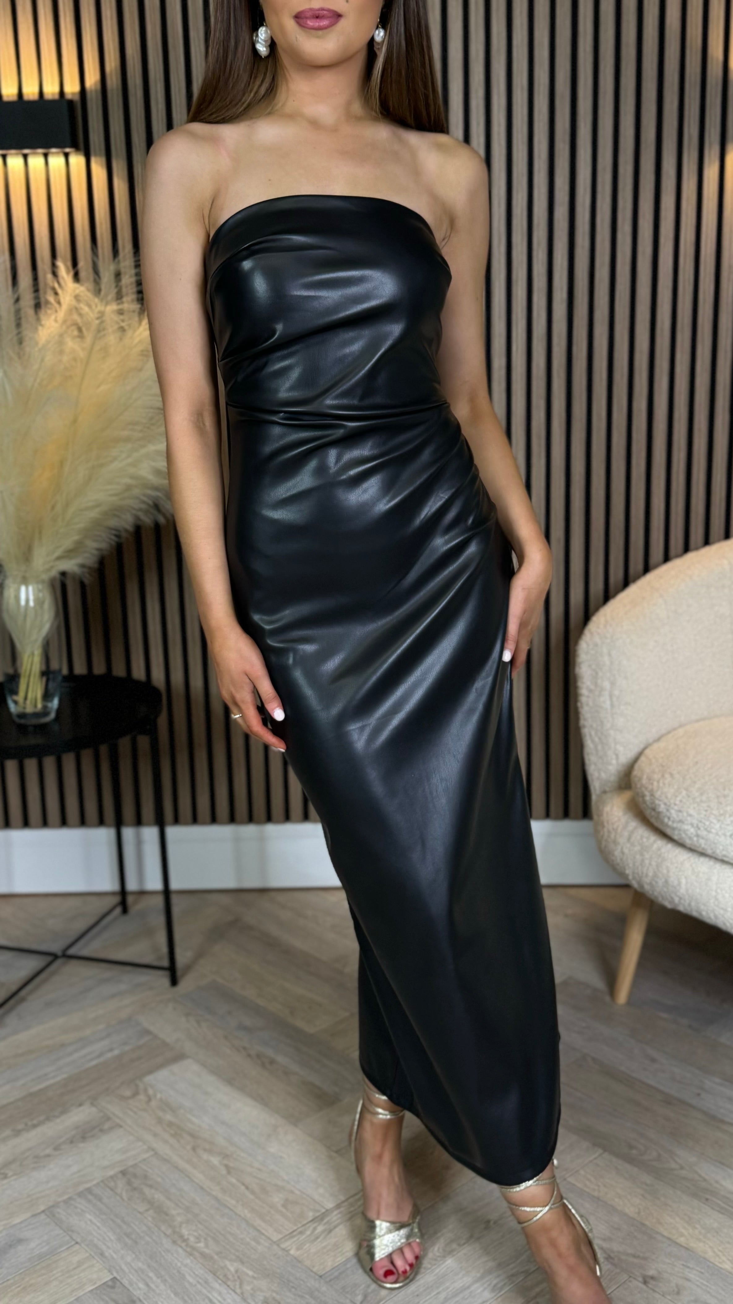Drea Black Leather Look Ruched Bandeau Midi Dress