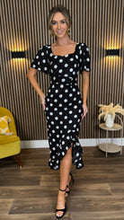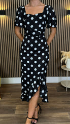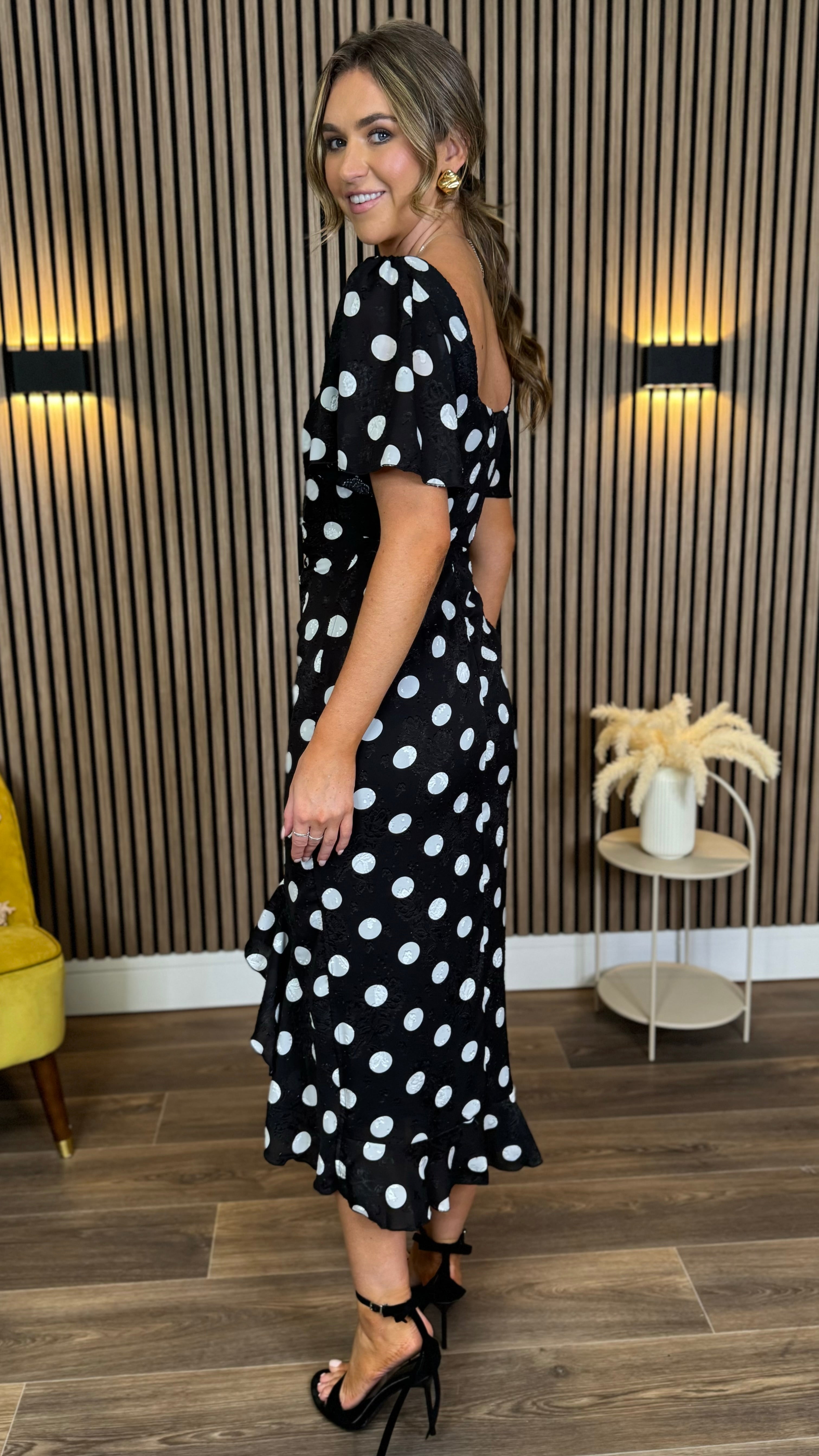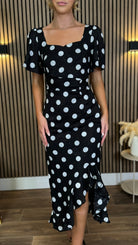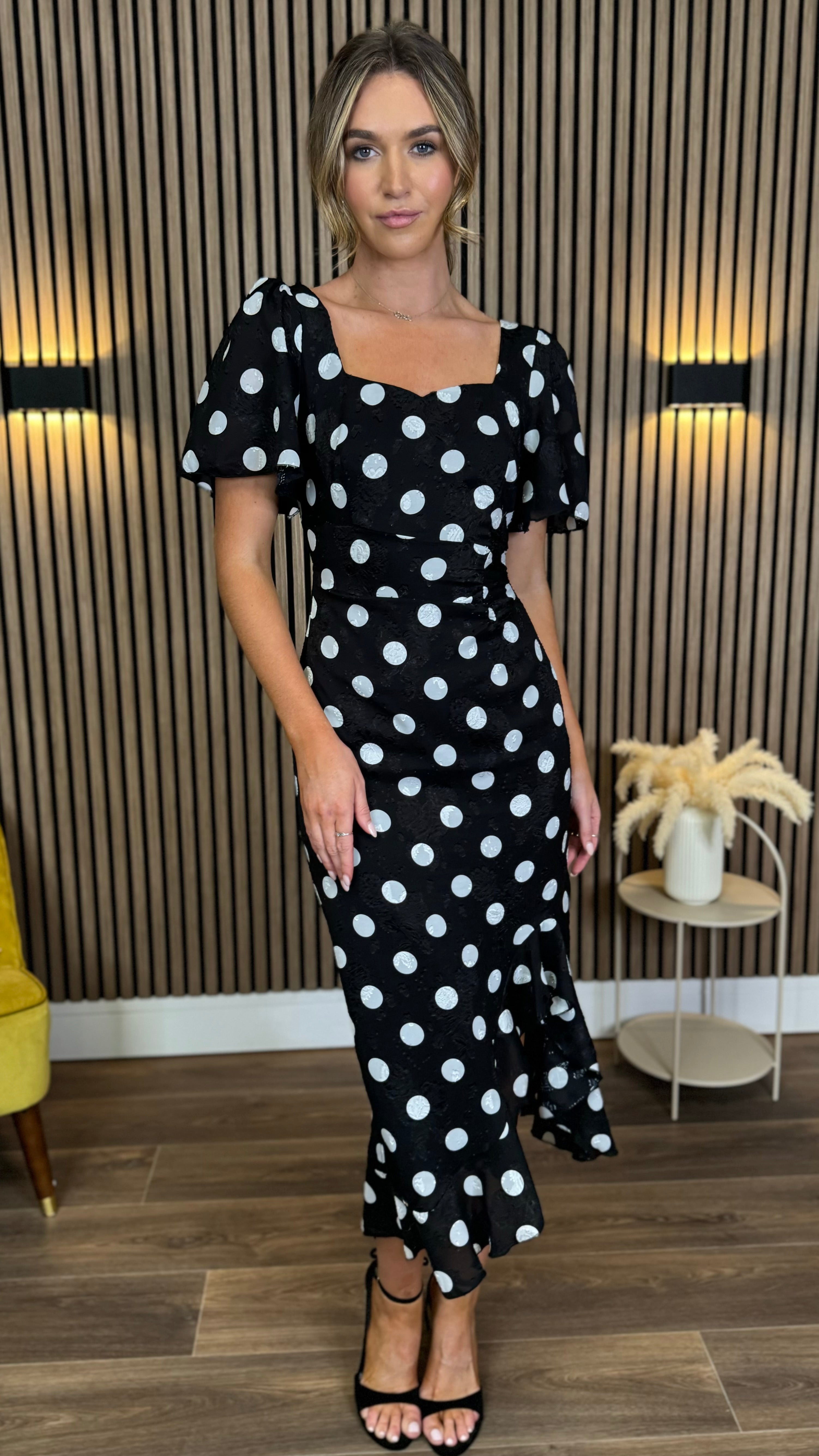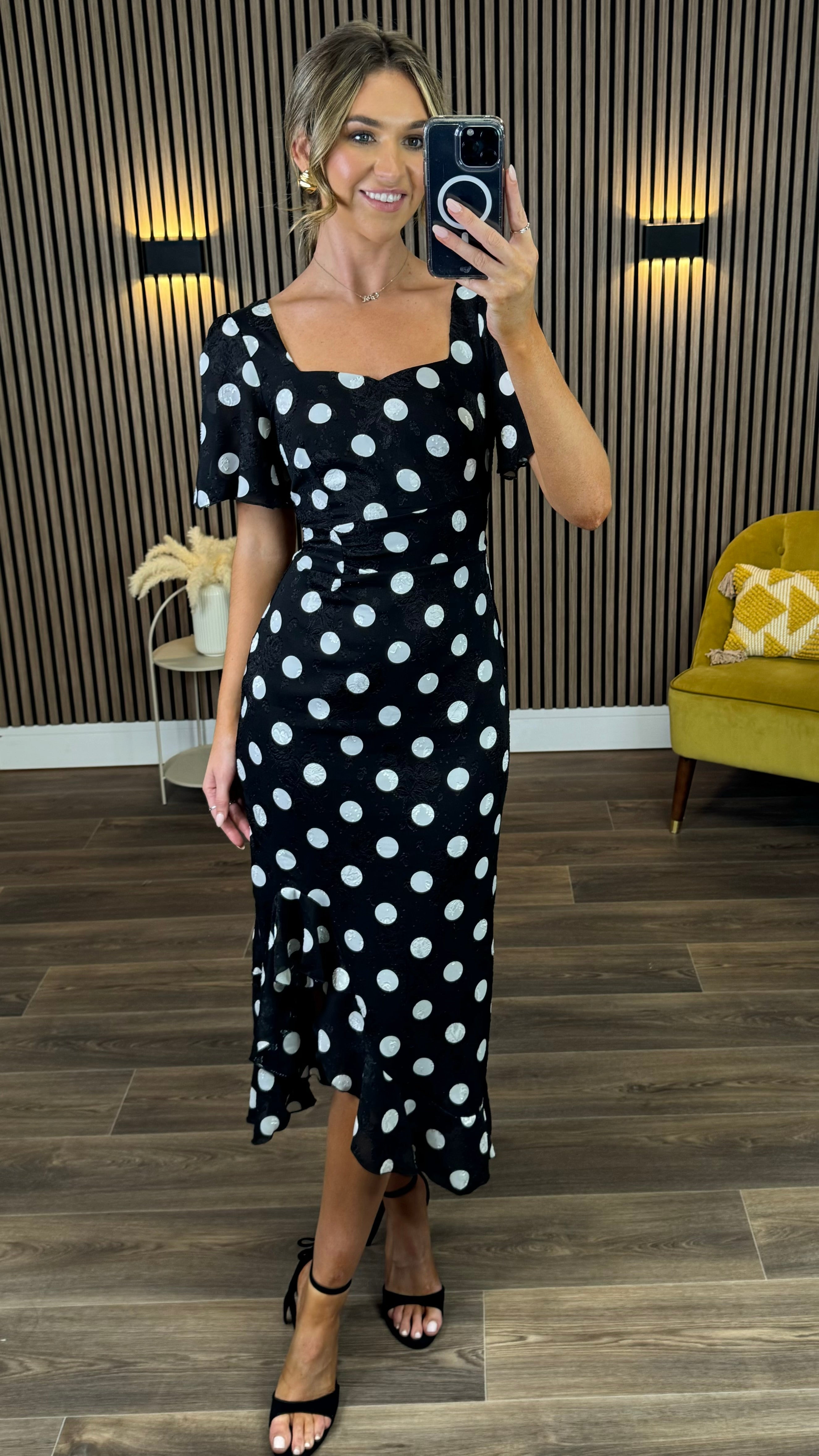 Step out in style with the Easkey Black & White Spot Burnout Ruched Midi Dress! 💃 Its sweetheart neckline and waist-cinching ruching create a flattering silhouette, while delicate frills add a playful touch. Crafted from luxurious burnout fabric, this dress blends chic comfort with effortless elegance. Perfect for pairing with heels and subtle jewellery for a look that turns heads! ✨👗