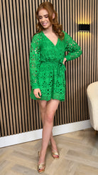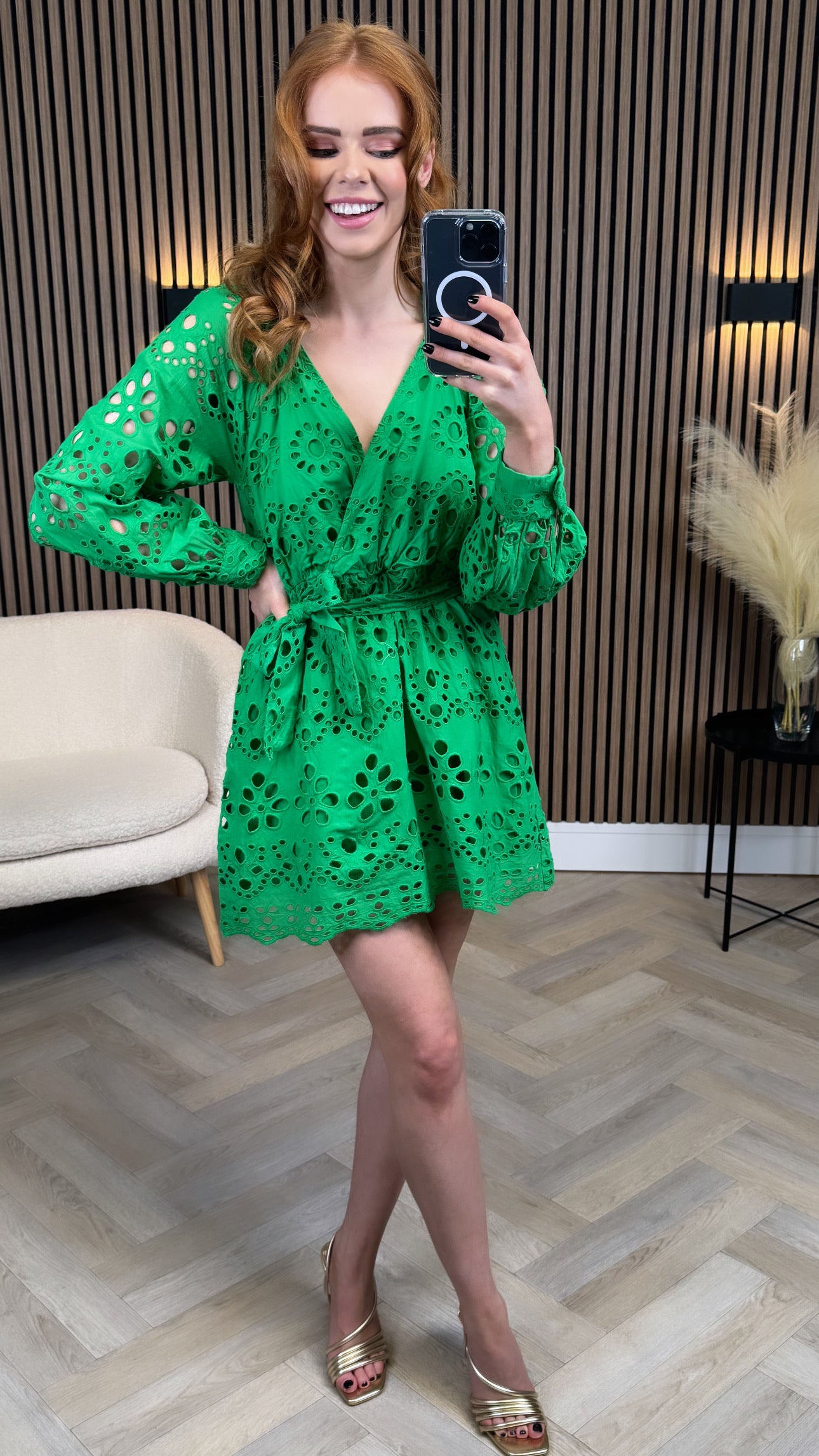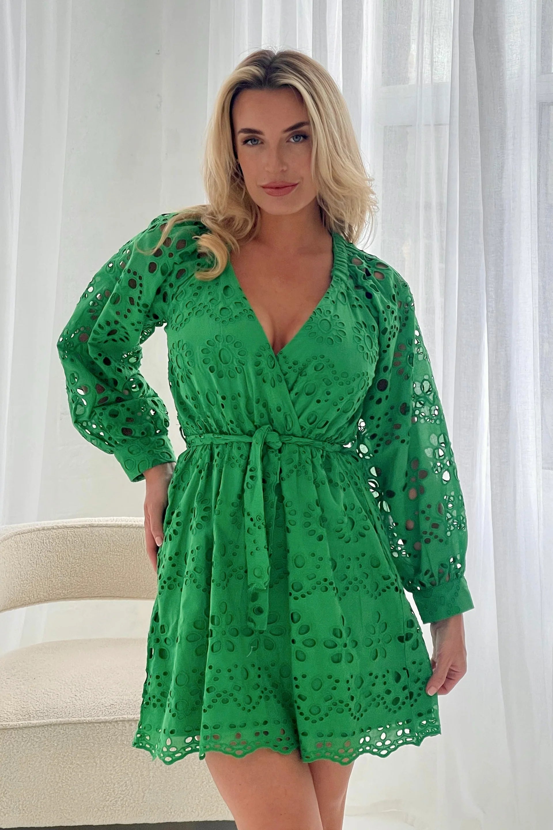 Elodie Green Broidery Wrap V Neck Mini Dress