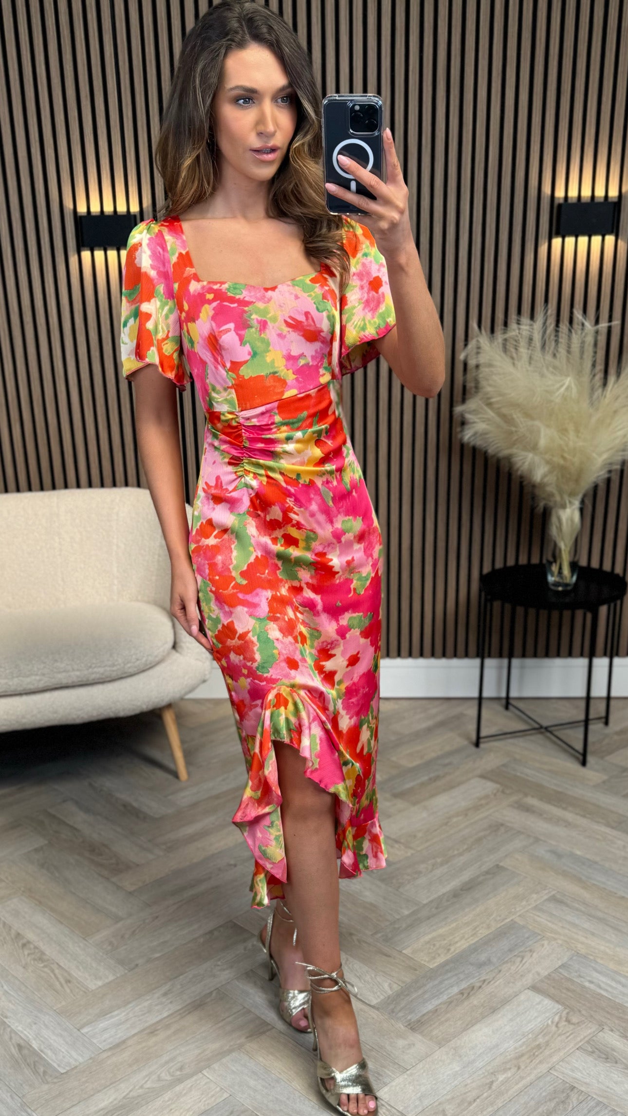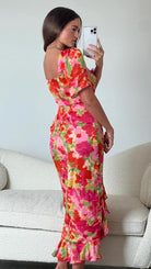 Introducing the Erica Orange Floral Burnout Ruched Midi Dress 😍 Elevate your wardrobe with this stylish piece, featuring a sweetheart neckline, waist-enhancing ruching, and delicate frills. The luxurious burnout fabric adds a touch of elegance, perfect for any occasion. Style with heels and minimal jewelry for a chic look 👠💎