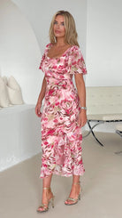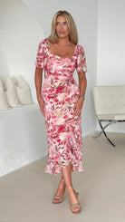 Introducing the Erica Pink Multi Floral Burnout Ruched Midi Dress 😍 Elevate your wardrobe with this stylish piece, featuring a sweetheart neckline, waist-enhancing ruching, and delicate frills. The luxurious burnout fabric adds a touch of elegance, perfect for any occasion. Style with heels and minimal jewelry for a chic look 👠💎