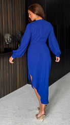 Evangeline Royal Blue Long Sleeve Wrap Asymmetric Midi Dress