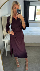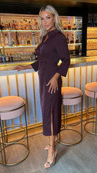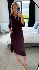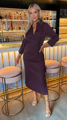 Stay on trend with our Harlyn Burgundy 3/4 Sleeve Shirt Midi Dress! Featuring cuffed sleeves, classic collar, button front top, gathered waist, and midi length skirt with side splits. Perfect for day or night - just add flats or heels and some chic jewelry! 🌟