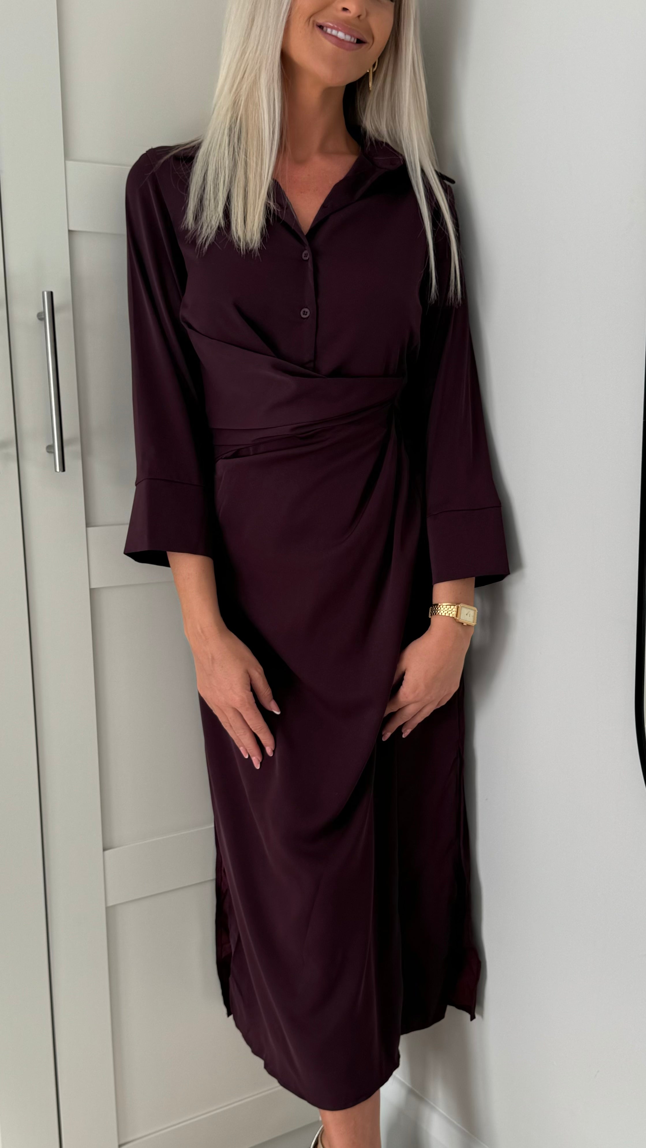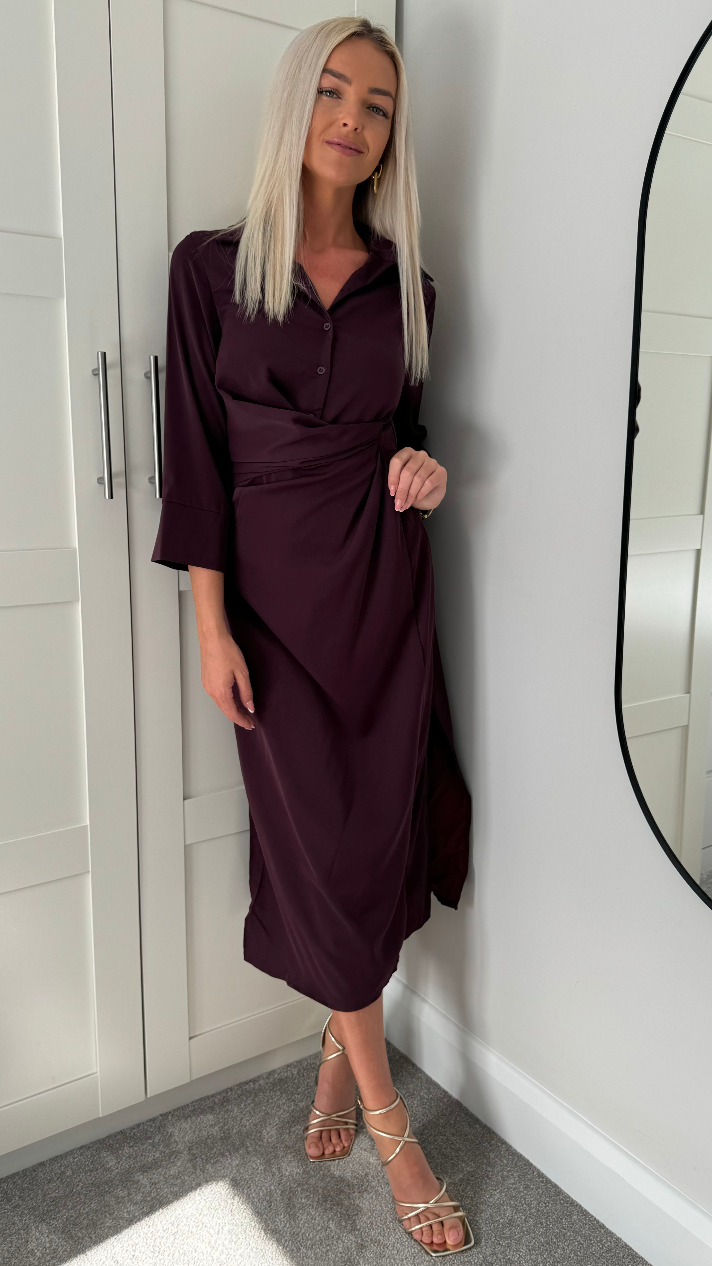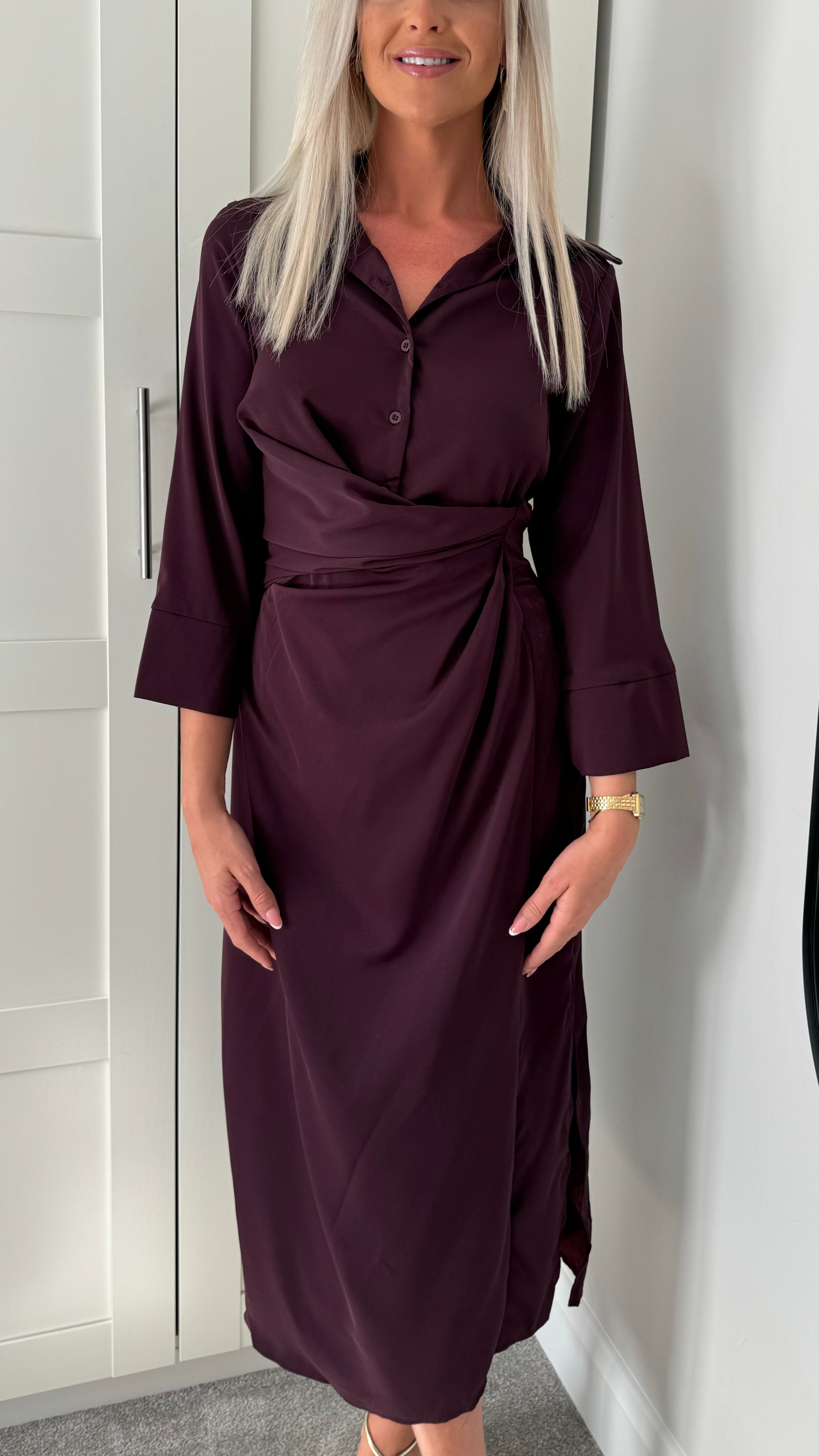 Harlyn Burgundy 3/4 Sleeve Gathered Waist Shirt Midi Dress