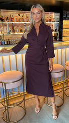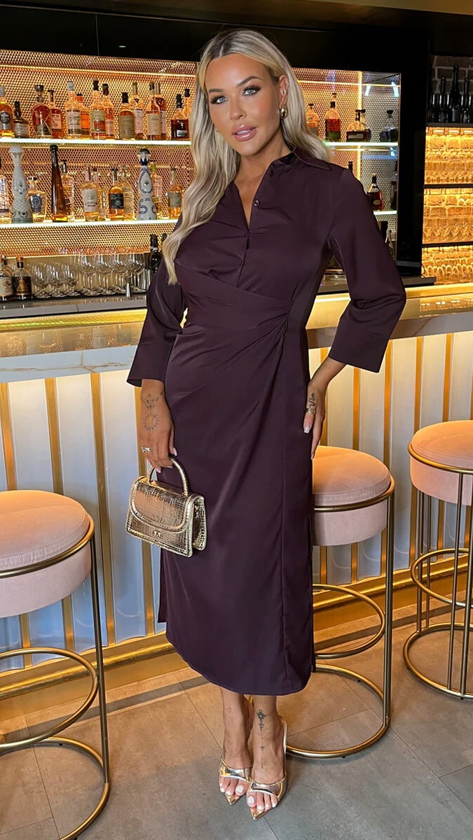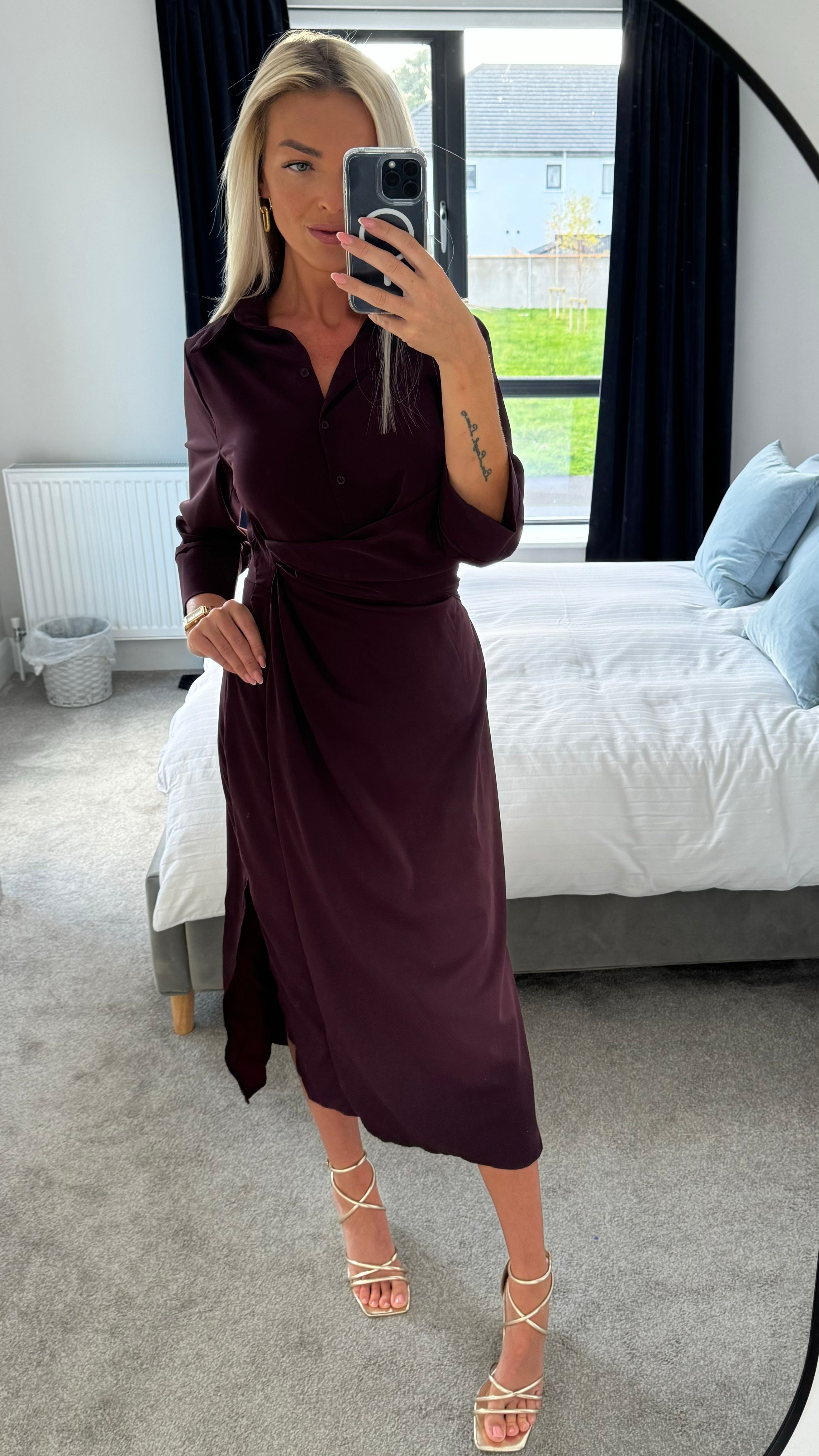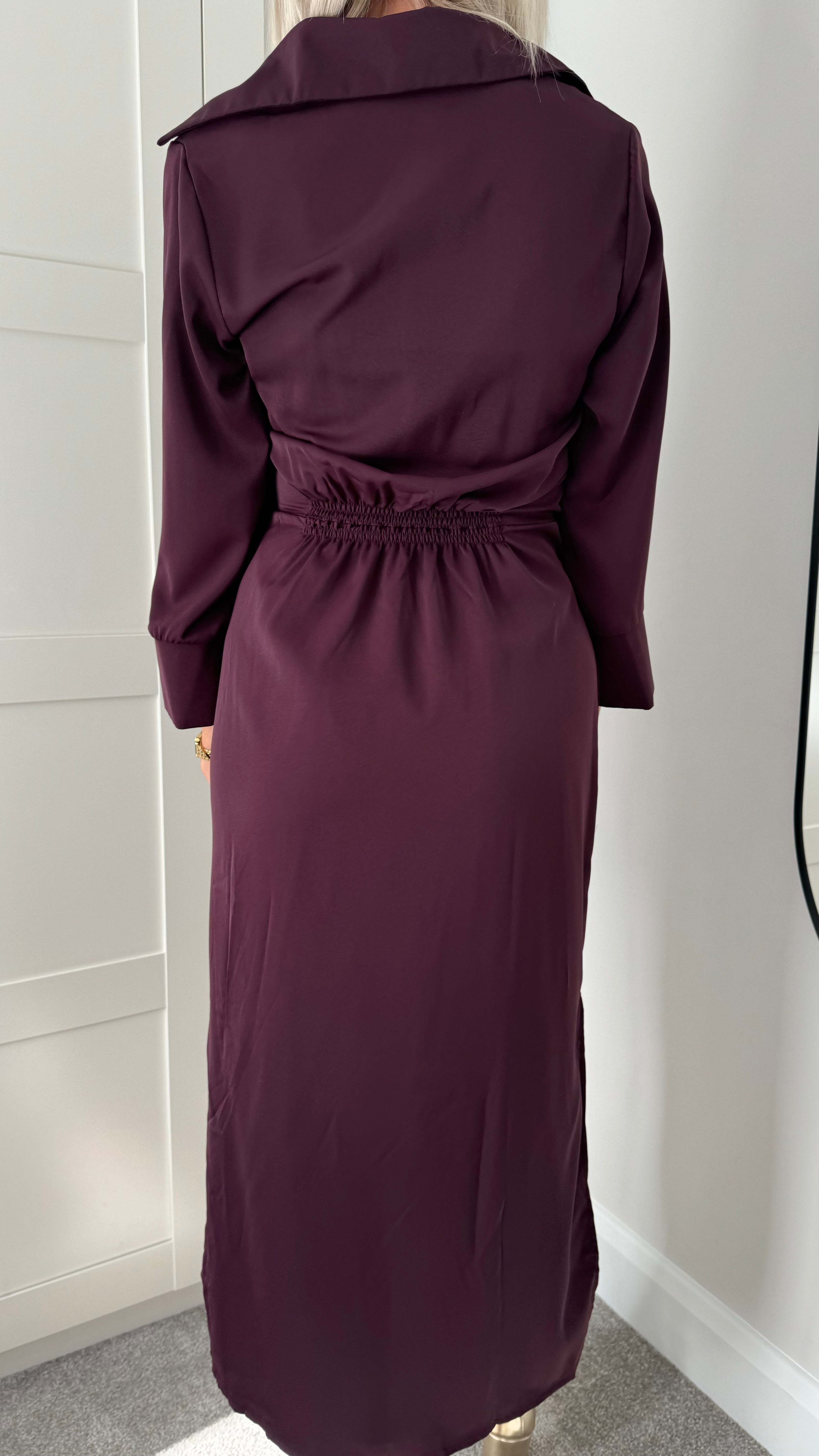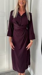 Harlyn Burgundy 3/4 Sleeve Gathered Waist Shirt Midi Dress