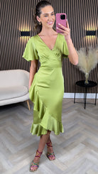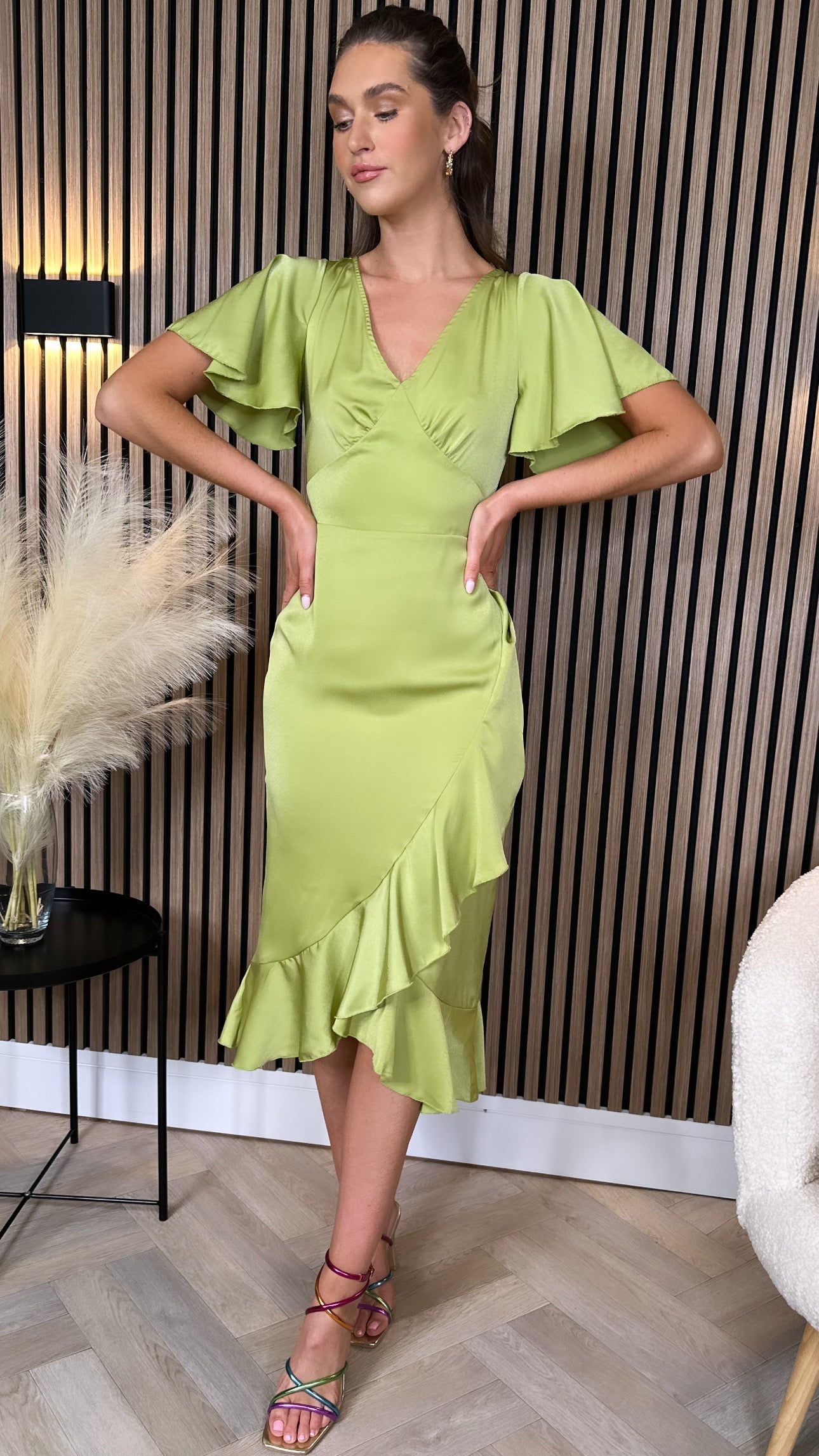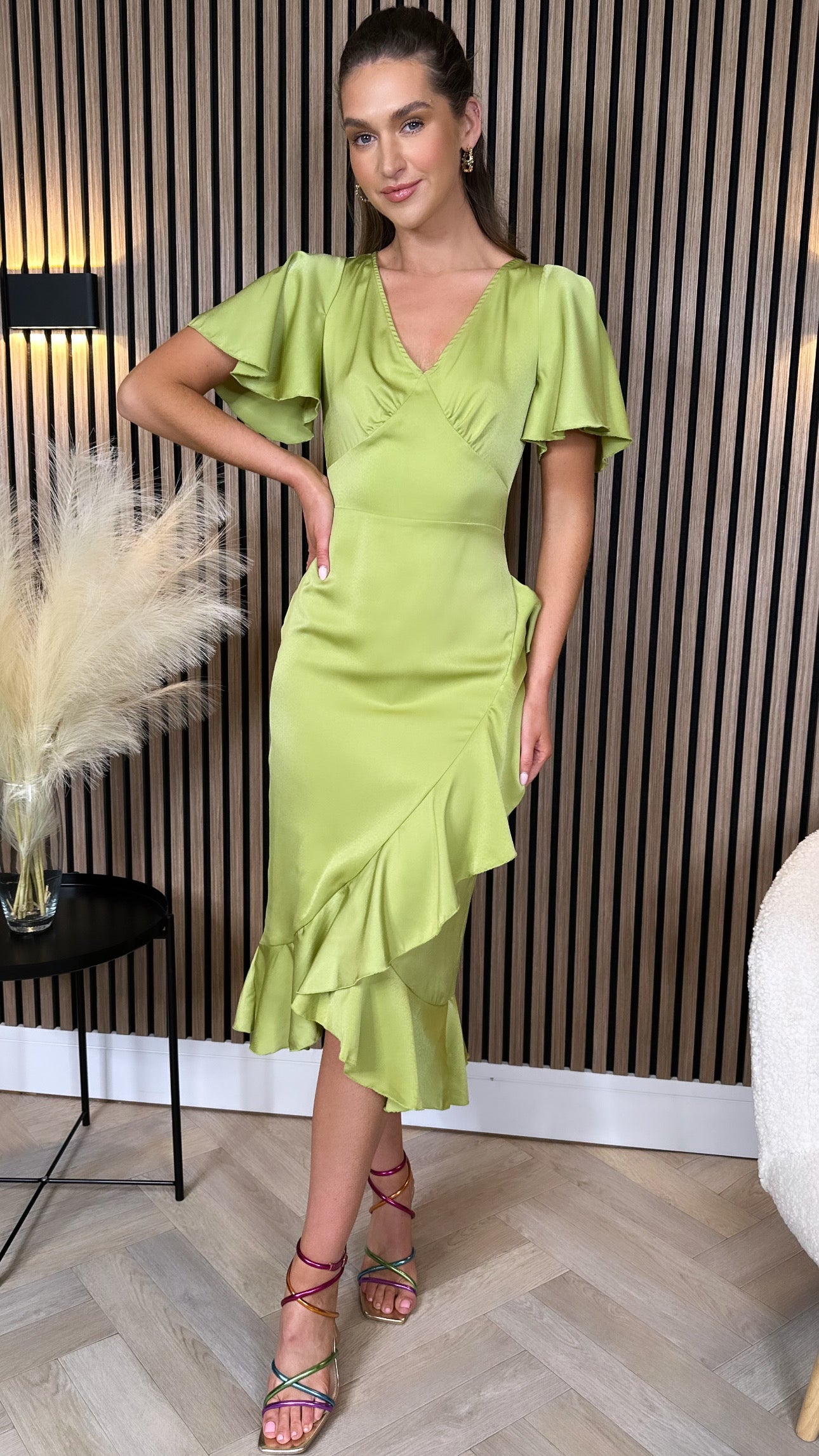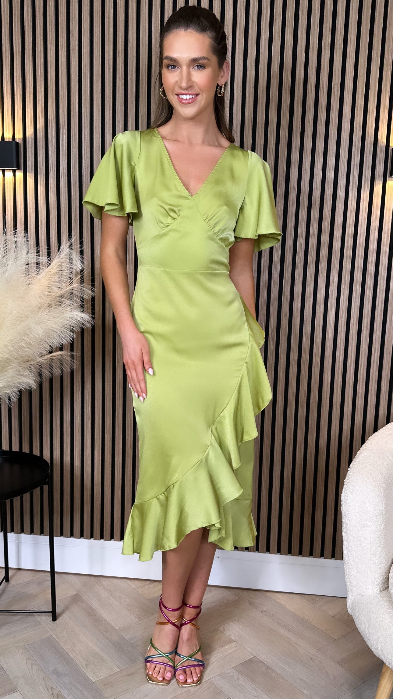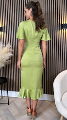 Unleash your inner luxury lover with our Karen Lime Green Frill Detail Midi Dress! This midi dress boasts angel sleeves, a sultry V-neck with ruched bust cups, and a playful frilled wrap skirt. Perfect for any occasion, it radiates sophistication and exclusivity. Elevate your style game with this stunning piece. 😍