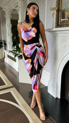 Expertly crafted with a chic floral print, our Laken Black & Lilac Midi Dress is the perfect addition to your wardrobe. With its one shoulder-like top and adjustable strap, cowl neckline, and side gathering on the midi skirt, this dress is both fashionable and functional. Elevate your style with some strappy heels and a coordinating bag for a flawless date night ensemble. 🌺