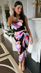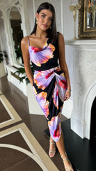 Laken Black & Lilac Floral Print Strap Detail Gathered Skirt Midi Dress