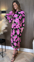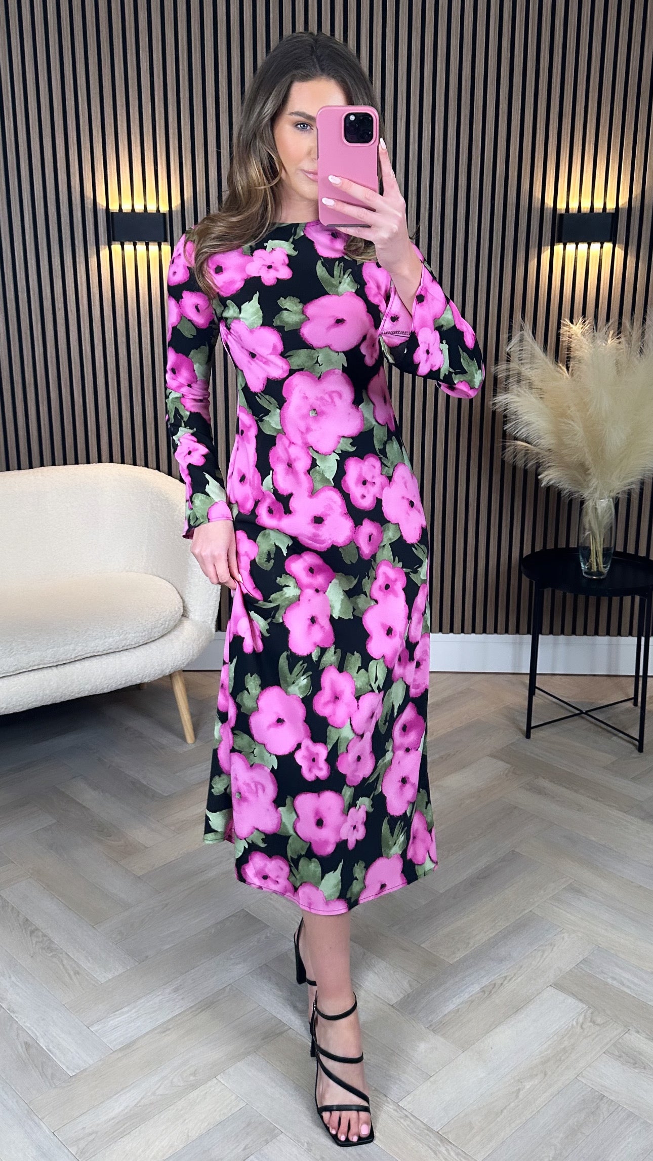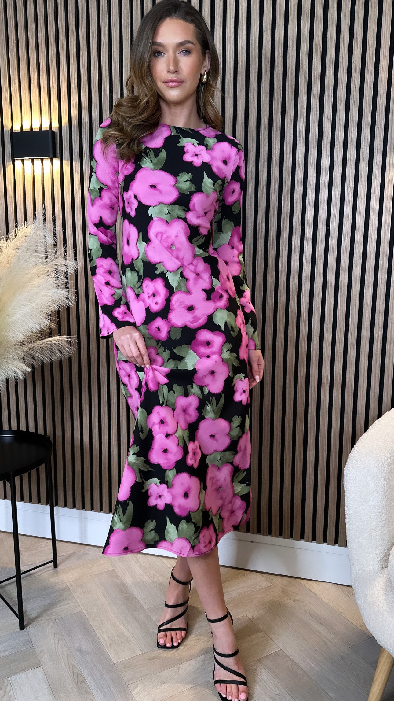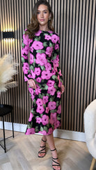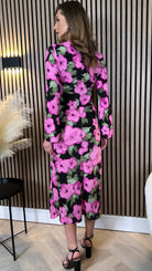 Get ready to bloom in the Lynneth Pink Floral Printed Midi Dress! With its playful pink floral print and flowy midi length, this dress is perfect for any occasion. The long sleeves and round neckline add a touch of elegance, making you feel confident and stylish. 🌸🌼
