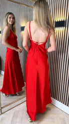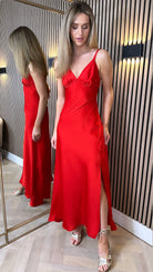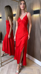 Make a stylish statement in the Melodie Red Satin Finish Midi Dress! With its double cami straps and side split, this dress is perfect for any occasion. The v neckline adds a touch of sophistication, making you stand out in any crowd. 💃🏼