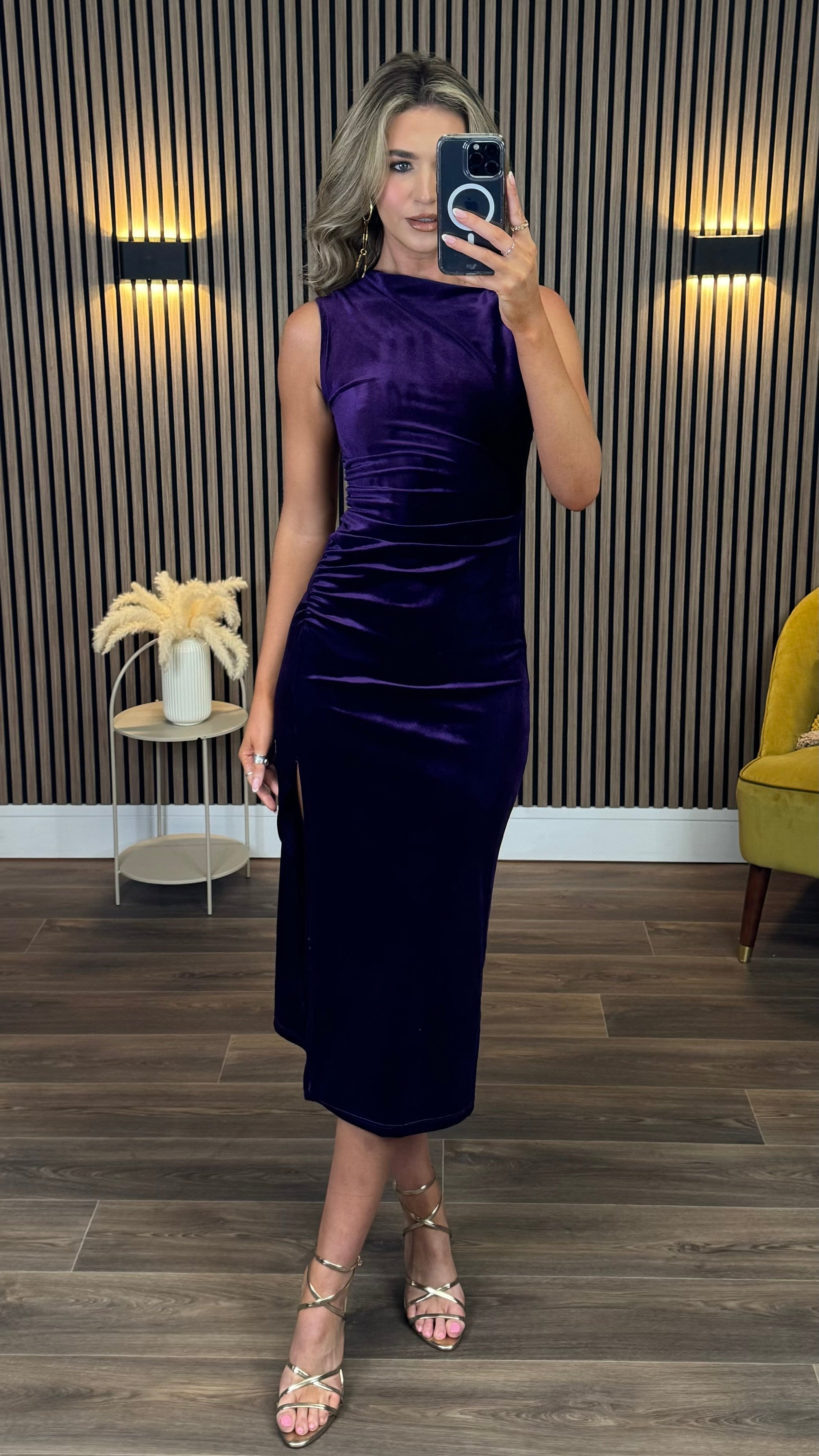 Unleash your inner glamour with the Monroe Purple Velvet Finish Midi Dress! This stunning sleeveless dress features ruched details and a playful side split, perfect for any occasion. Plus, the unique shoulder feature adds a trendy touch. Embrace your chic side with this dress! ✨🔥