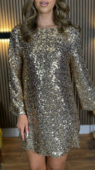 Sparkle and shine in our Nikita Gold Sequin Dress! With its stunning sequin design and playful black bow detail, this mini dress is sure to make a statement. Perfect for any special occasion, this dress is both fun and stylish. 💫🎀