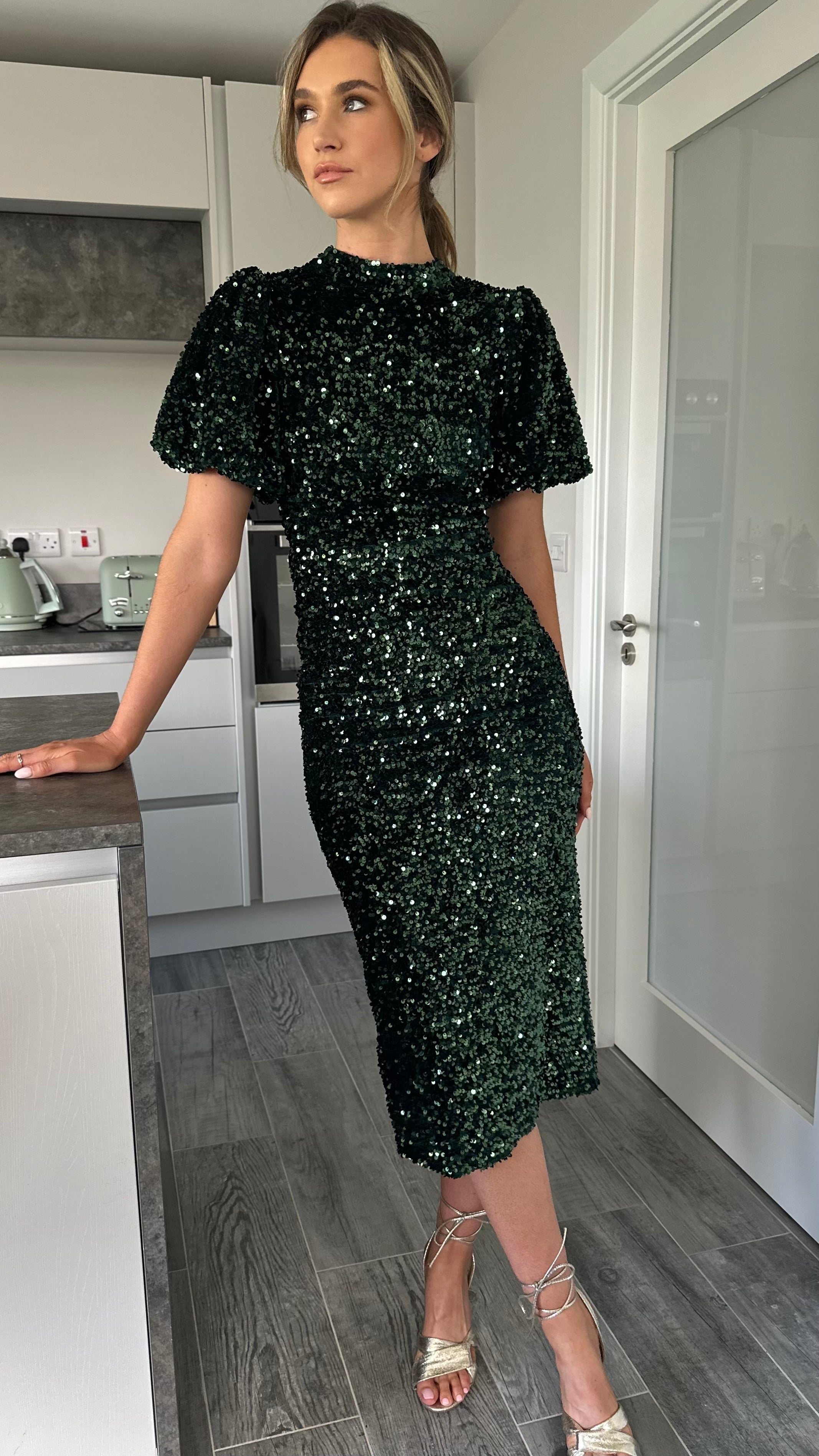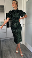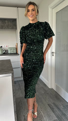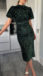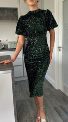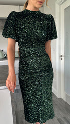 Meet your new go-to party dress: the Rachelle Green Sequin Bow Back Detail Midi Dress! With playful puff sleeves and a chic high neckline, this dress adds just the right amount of flare. The back slit offers a touch of sexiness, while the tie bow detail and cut out back will make heads turn. Perfect for any occasion, this midi length dress is sure to make a statement. 💃