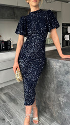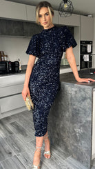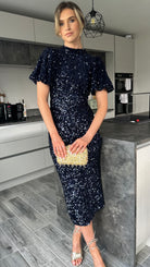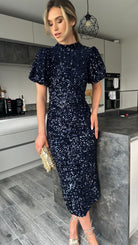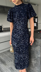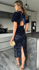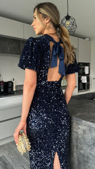 Rachelle Navy Sequin Bow Back Detail Midi Dress