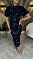 Meet your new go-to party dress: the Rachelle Navy Sequin Bow Back Detail Midi Dress! With playful puff sleeves and a chic high neckline, this dress adds just the right amount of flare. The back slit offers a touch of sexiness, while the tie bow detail and cut out back will make heads turn. Perfect for any occasion, this midi length dress is sure to make a statement. 💃