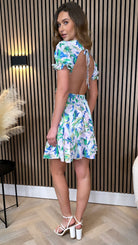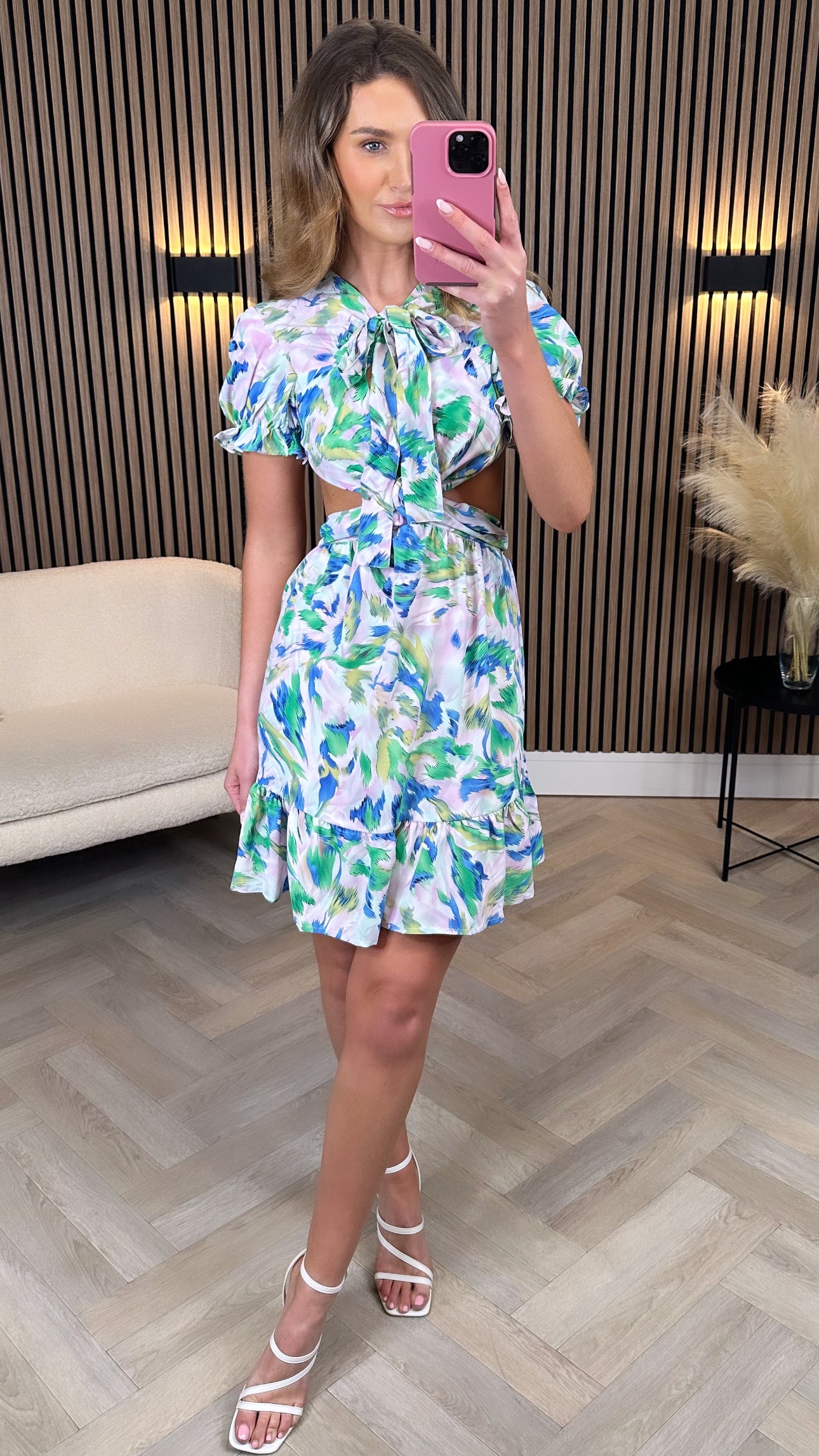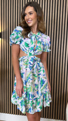 This Rhoda Green Printed Cut Out Mini Dress is a playful addition to your wardrobe. With a trendy v neckline and double tie detail at the back, this dress is effortlessly stylish. The belted effect with cut out detail adds a quirky touch. 💙👗