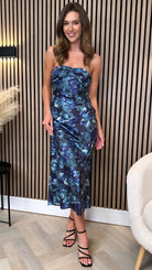 Introducing the Rozario Strapless Midi Dress - the perfect blend of elegance and playfulness 🎉 This dress features a unique ruched bust detailing that highlights your curves and adds a touch of whimsy. With its bold blue and purple color combination, you'll stand out at any event.