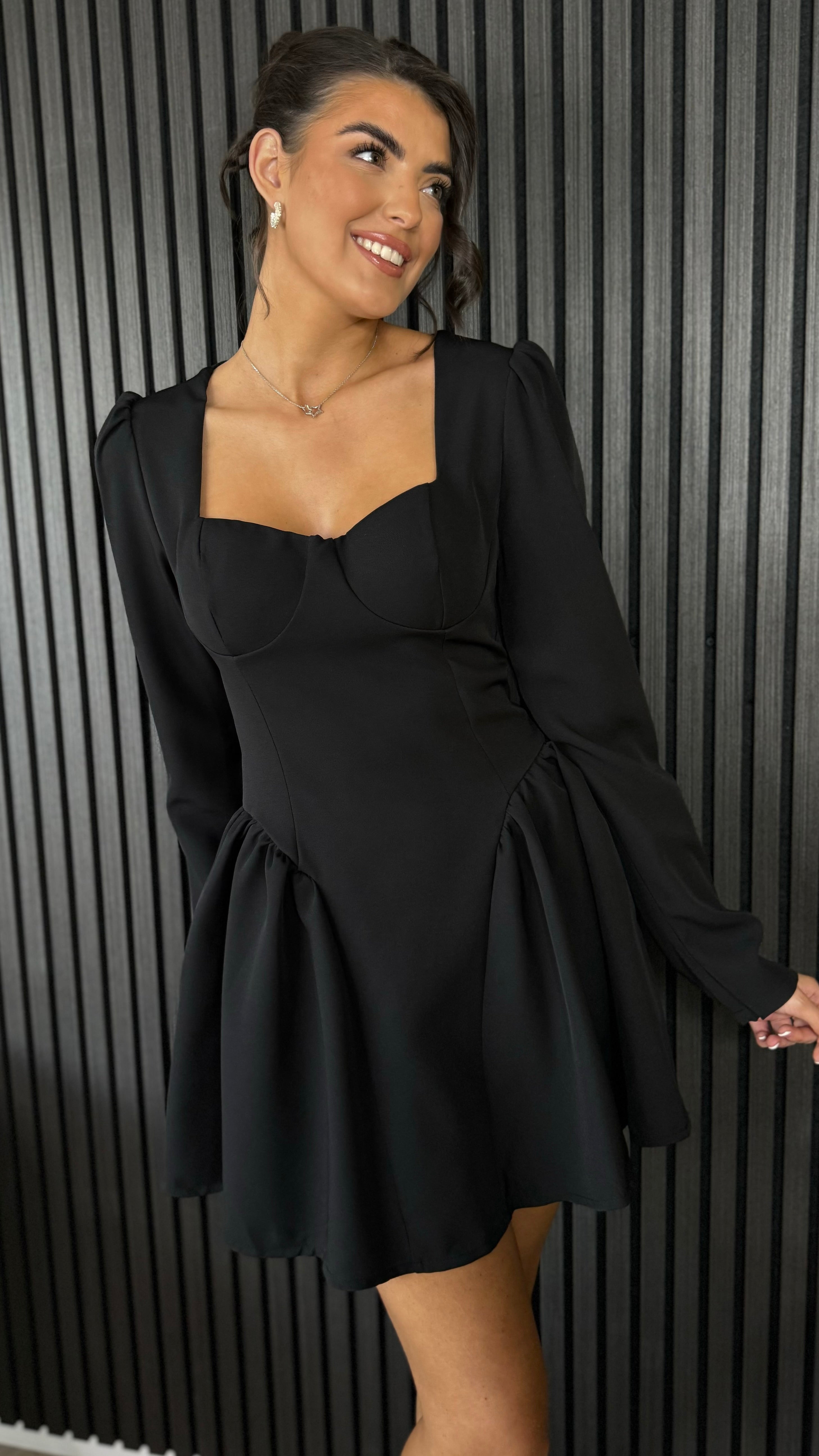 Ruby Black Square Neckline Full Skirt Detail Mini Dress