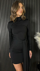 This Sara Black Mini Dress features a trendy high neck and long sleeves, for a stylish and cozy look. The ruched belted waist adds a touch of flattering detail. Get ready to say YES to effortless elegance with this cute and quirky mini dress! The included fabric belt is a unique and fun addition.