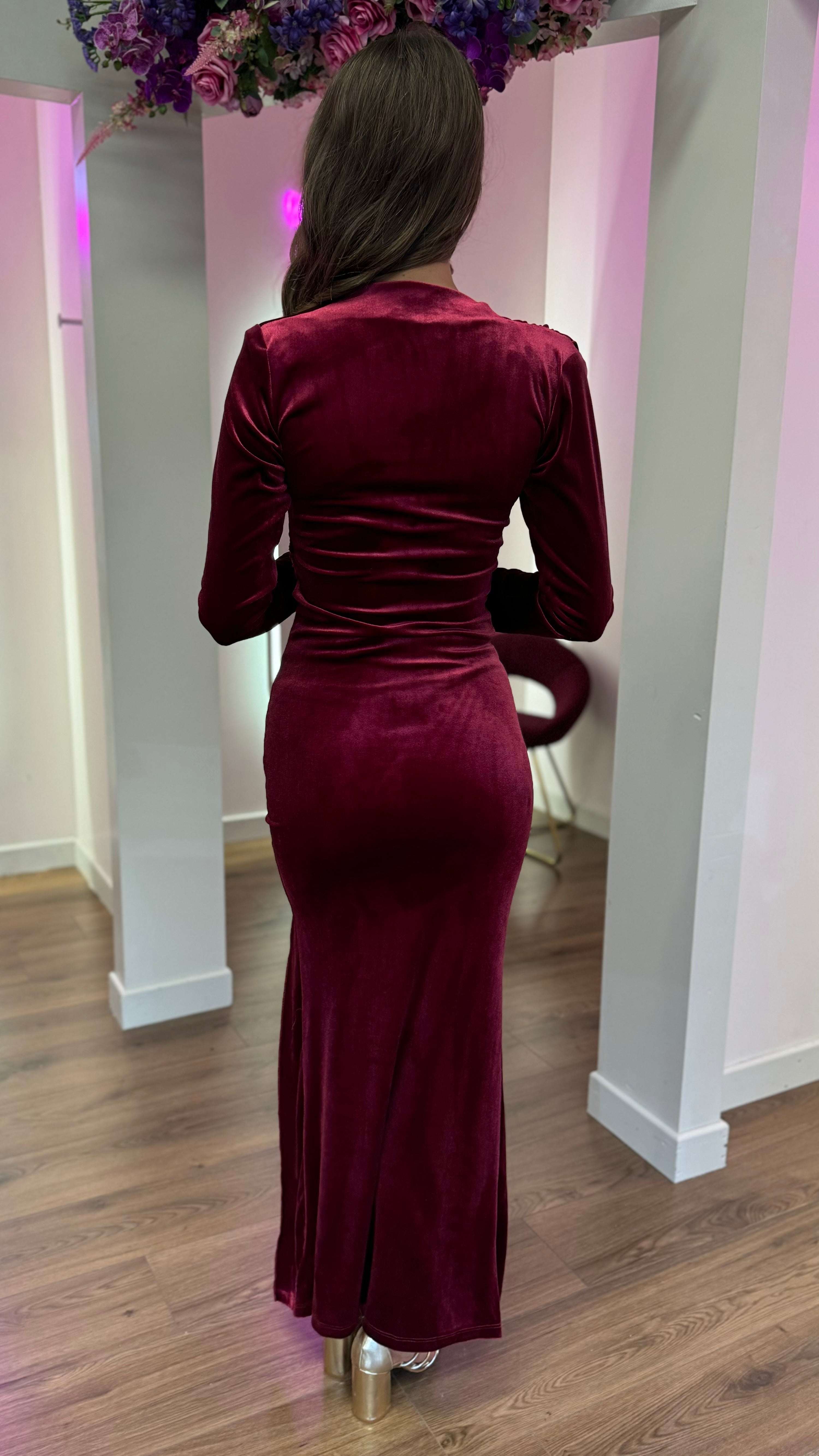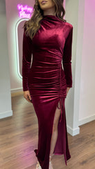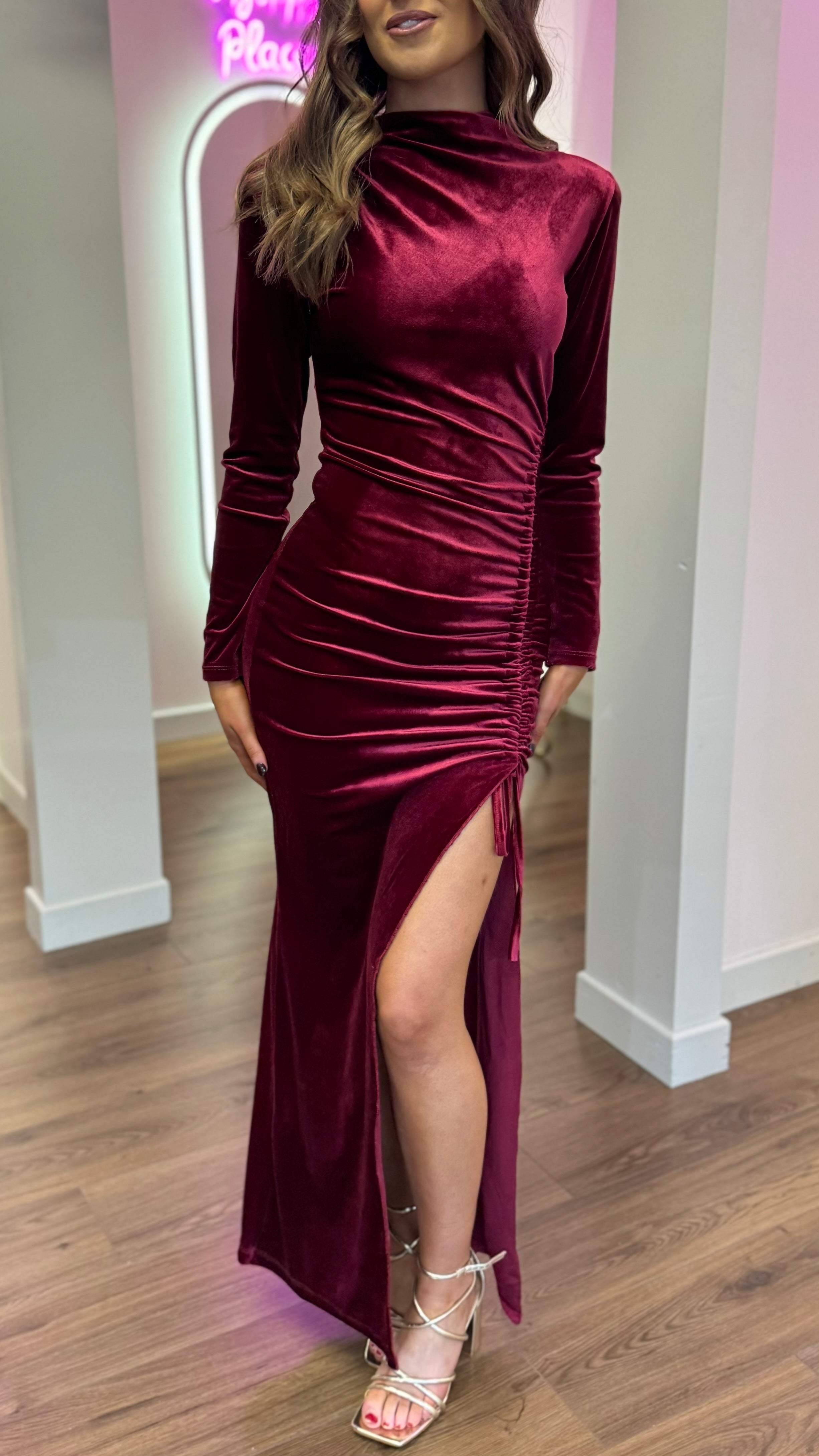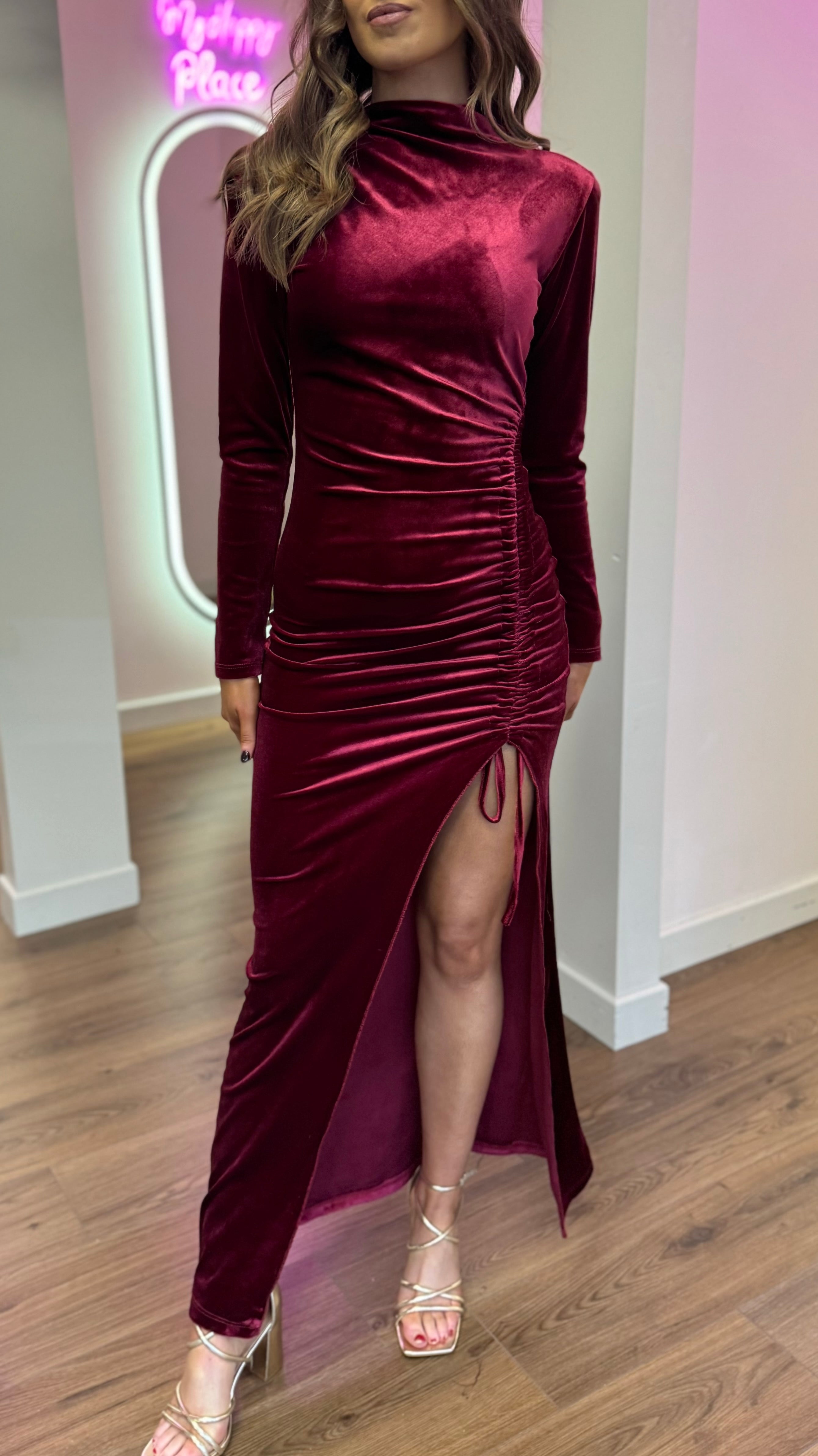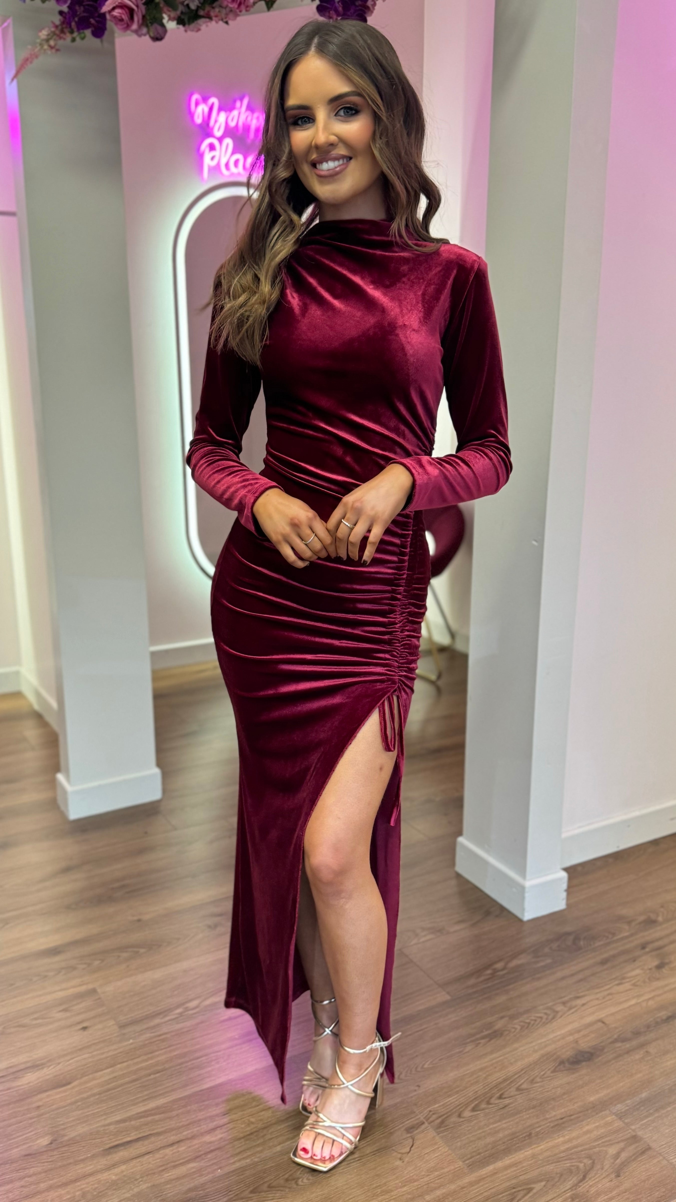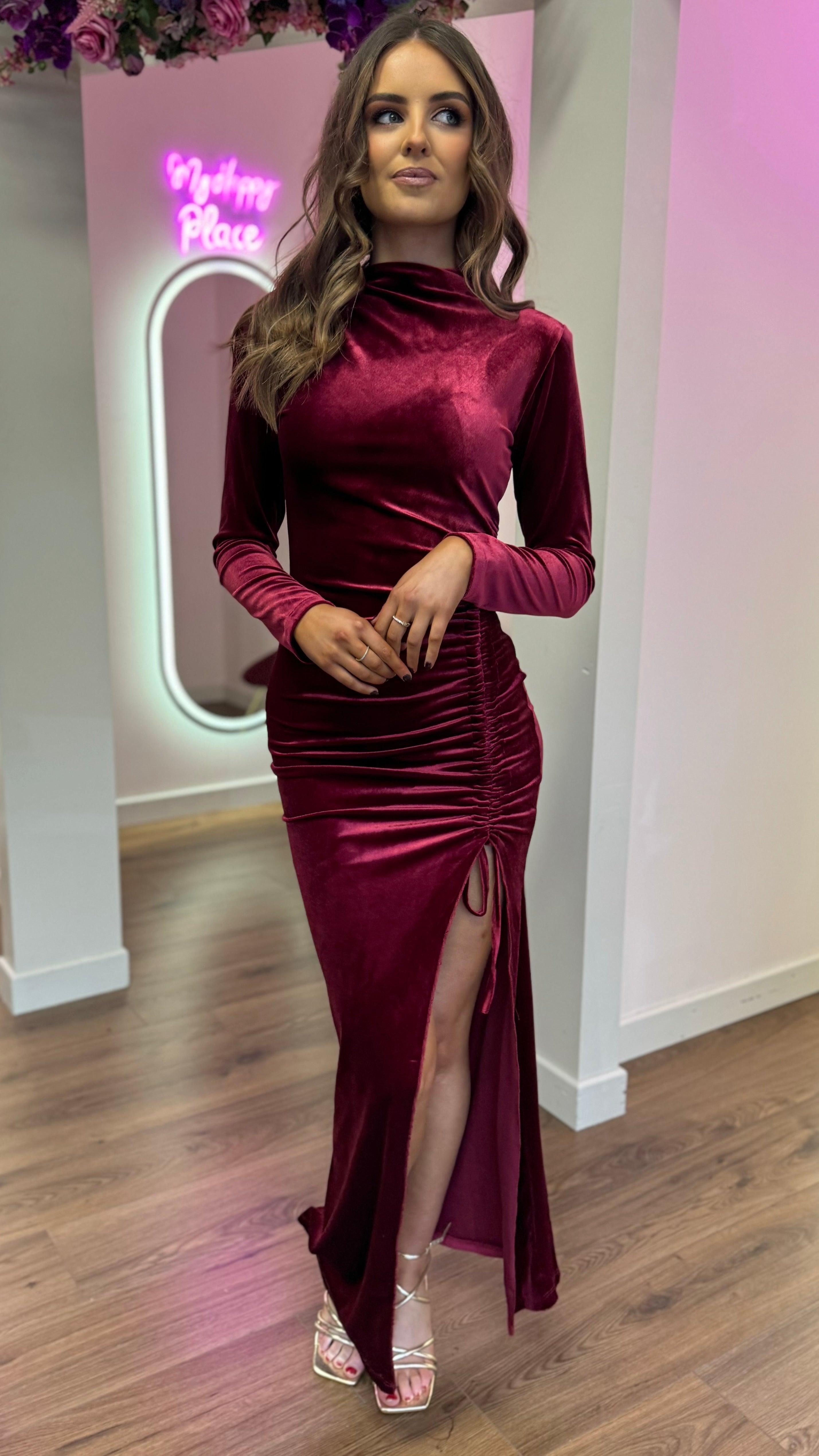 Sibyl Burgundy High Neck Velvet Ruched Tie Detail Midi Dress