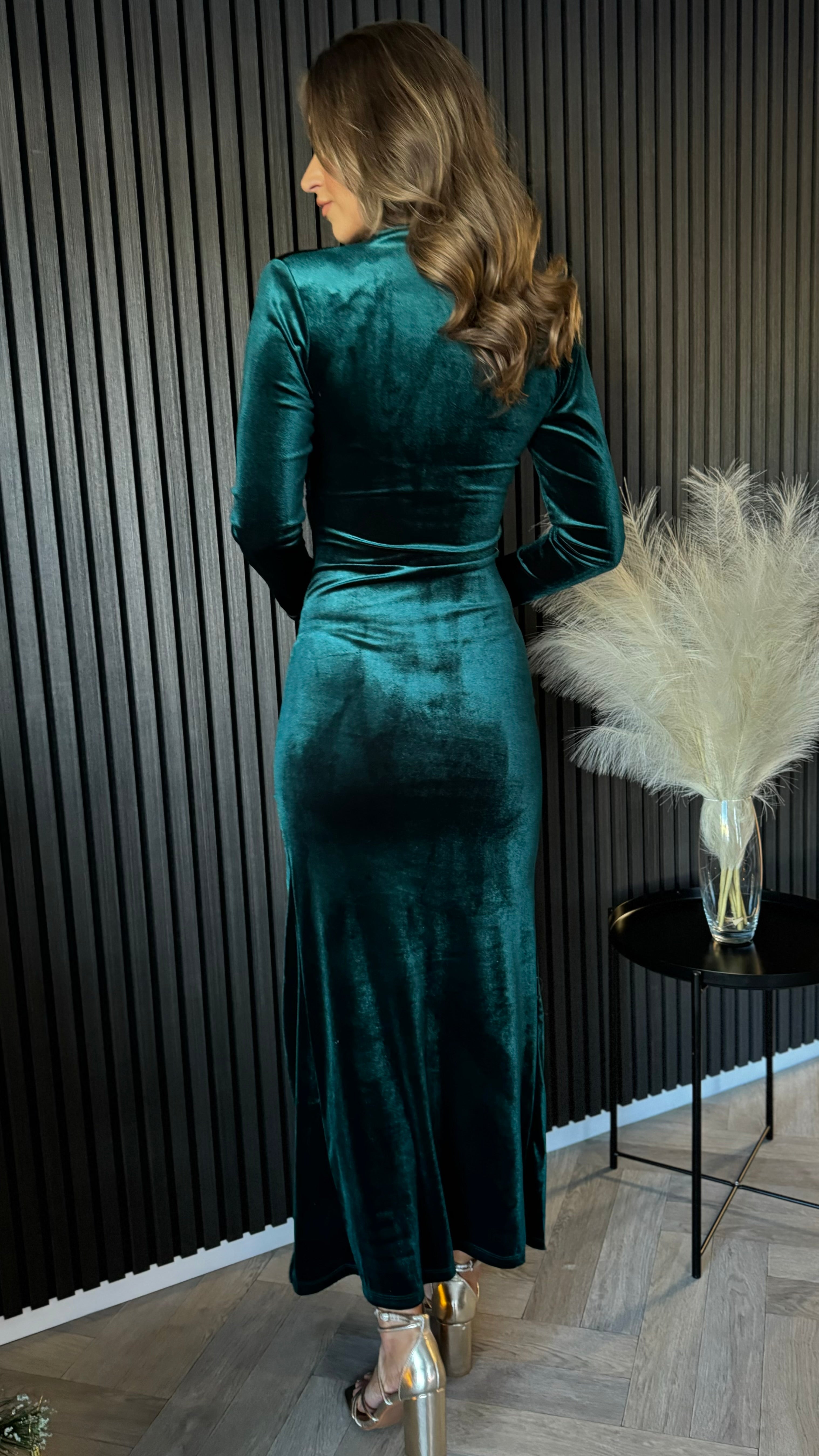 Sibyl Forest Green High Neck Velvet Ruched Tie Detail Midi Dress